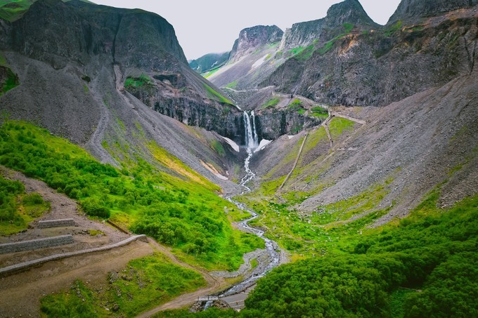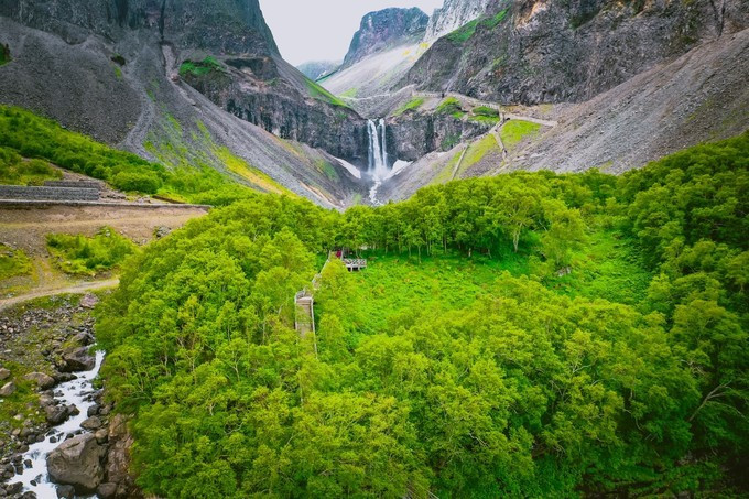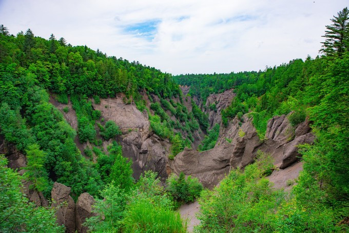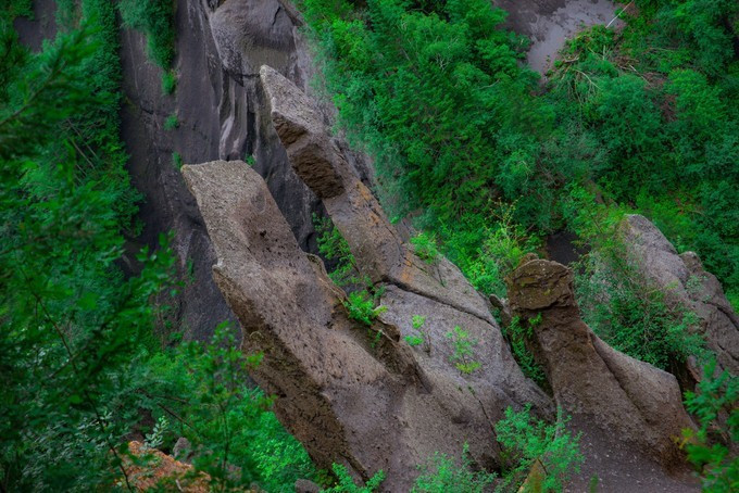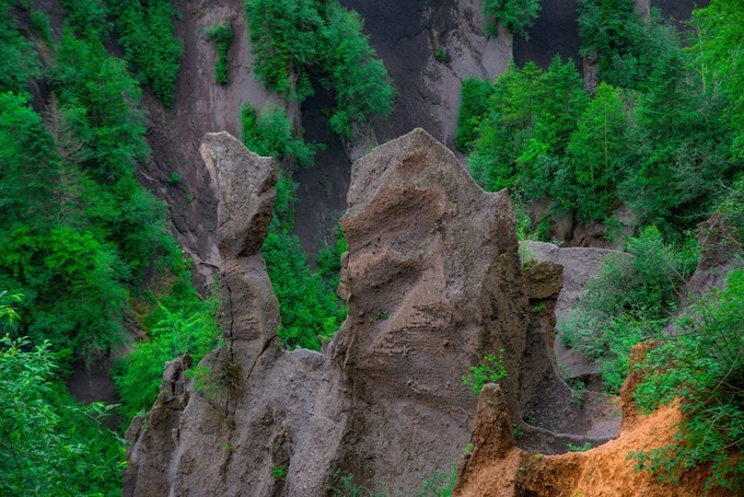 峡谷两岸生长着茂密的大森林,树木笔直粗壮,由于谷上低温潮湿,使得树木上挂满了苔藓,自然、原始之态尤为明显。这是一条极为壮观的大峡谷,所以峡谷两侧,特别是底河两岸的谷坡就显得异常陡峭;加上多年的寒冻风化,峡谷中的冰缘岩柱已在岁月的风雨剥蚀中,形成了各种各样的自然景观。