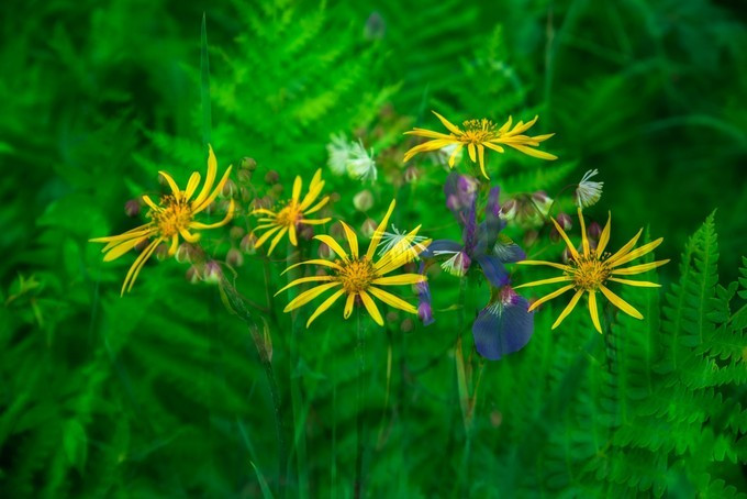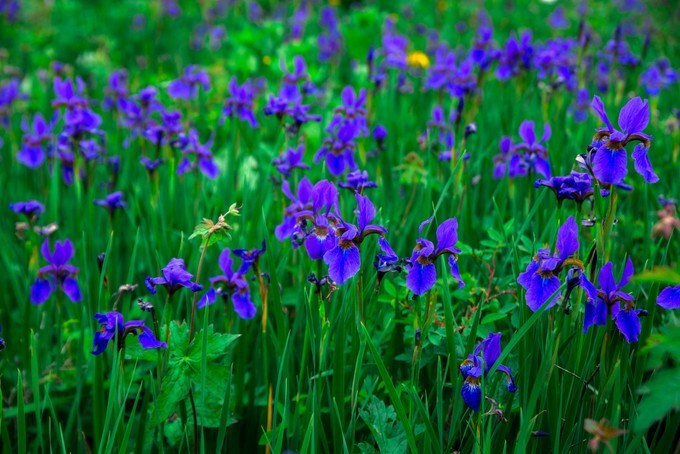 从远处望去,成片的鸢尾花在树林间向远处铺开,格外的壮观。蓝紫的鸢尾、黄色的野花、翠绿的林木交融在一起,显得更加的鲜艳和高贵,有诗赞美称:“百花争艳不觉奇,姹紫嫣红香万里,置身花间云飘处,疑是天堂花园里”。