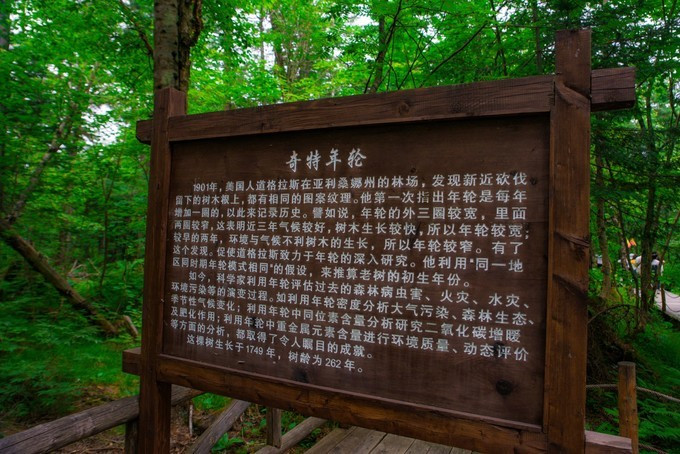 长白山 许多的树木都有百年以上,自从人们知道了用年轮来计算树木的树龄,有了很多有趣的发现。大峡谷里的有一块杉松冷杉树的横切面,在上面的年轮上标注了这棵树的生长时间线,知道了这棵树生长于1749年,树龄高达262年,十分的神奇。