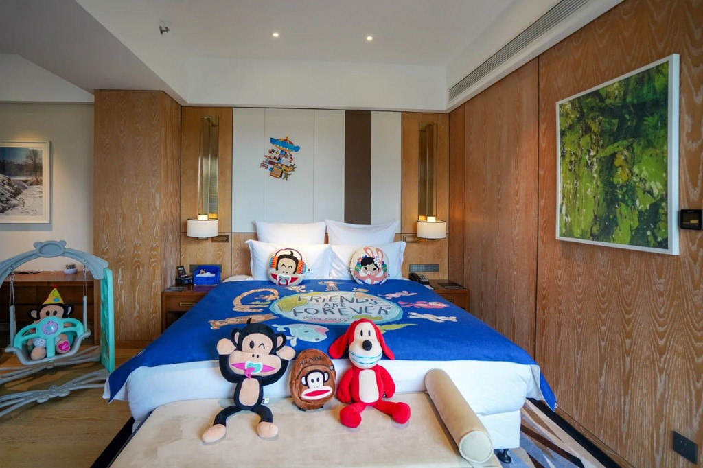 亲子家庭,可以选择酒店的主题亲子客房。有小黄鸭和大嘴猴主题亲子房,房间布满了卡通元素,帐篷、布偶、杯子、毛巾都印有可爱的卡通图案,细节之处也十分到位,小朋友住进来一定会爱得不行。