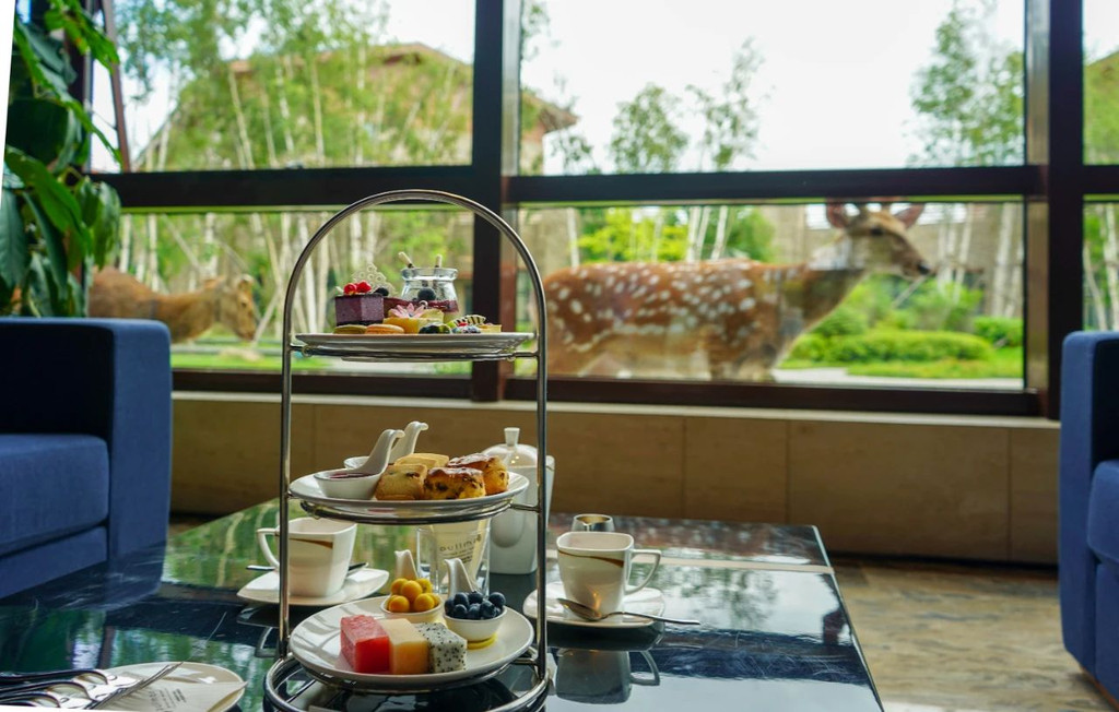 在2楼的大堂吧—冰凌吧可以喝茶、品酒(各国美酒或鸡尾酒),舒适轻松的环境,可以增加你的度假氛围。酒吧直面中庭花园,花园里有2只可爱的小鹿,你在喝下午茶的时候,会走到窗边来和你互动,特别有爱和独特的体验。