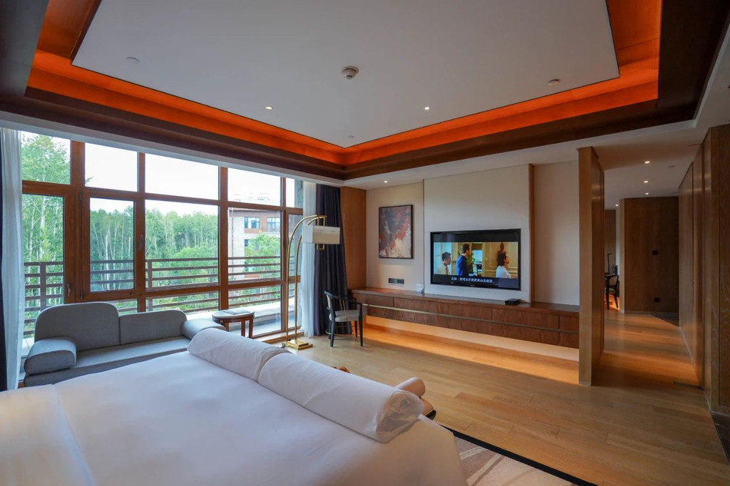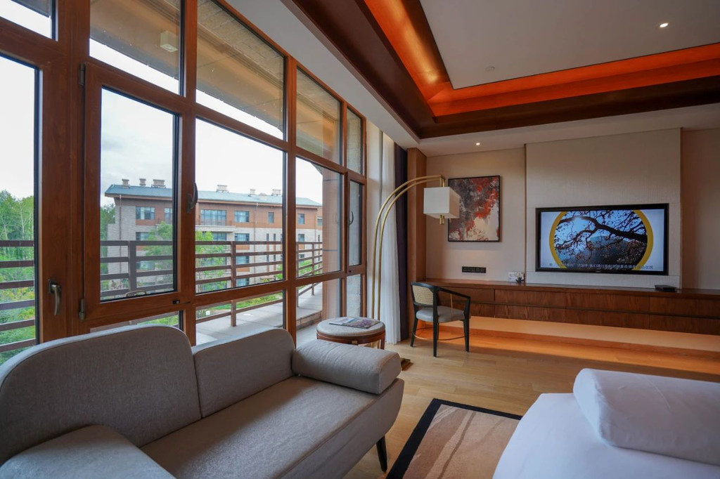 客房内就能坐享长白山的四季美景:夏季可赏葱郁桦林,冬日可远眺皑皑雪山……原木色调的客房设计及家具配置呼应室外风景。洗漱用品是铂尔曼品牌标配的美国百年草本老字号C.O. Bigelow。