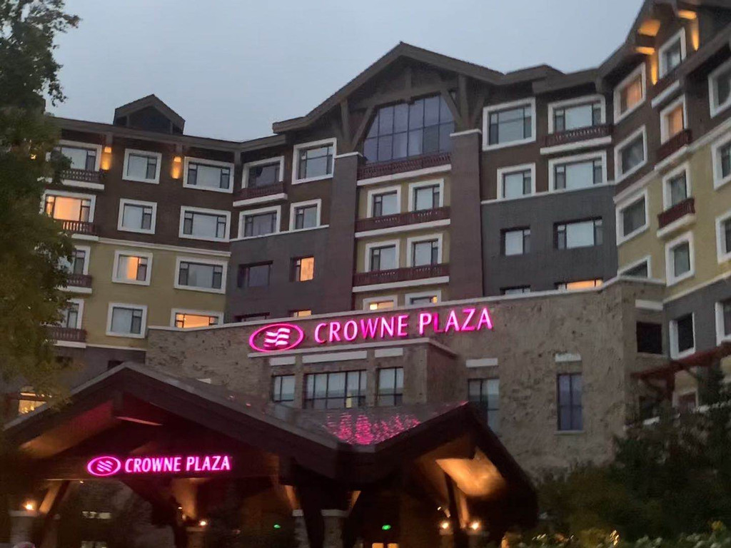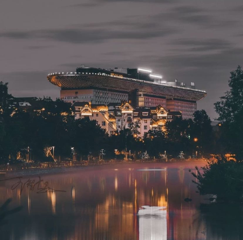 其实这家酒店全面叫“长白山长白天地度假酒店”,但造型长的像新加坡的帆船酒店,所以俗称“帆船酒店”,巍峨耸立,当你身处二道白河时,很容易就看到它,俨然成了小镇标志性建筑。我们住的民宿,就在这座酒店脚下。