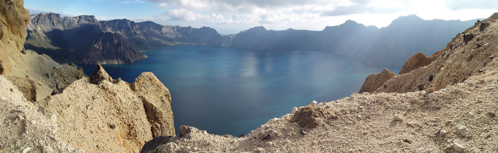 终于乘坐倒站车驾临北坡山顶,再一次欣赏天池的美景,不同于昨天的云雾缭绕,今天是一汪碧水,湖面平静无波,倒映着蓝天白云,看起来心情特别开阔。但是受地形的影响,北坡观赏天池很难观赏到湖面的全景,总有山石的各种阻挡,没有西坡观赏的角度好。但我们何其幸运,不但连着两天观赏到天池的美景,还是观赏到了截然不同的两种景致,欣赏了不同天气下同样美丽的天池,真的是不虚此行了!