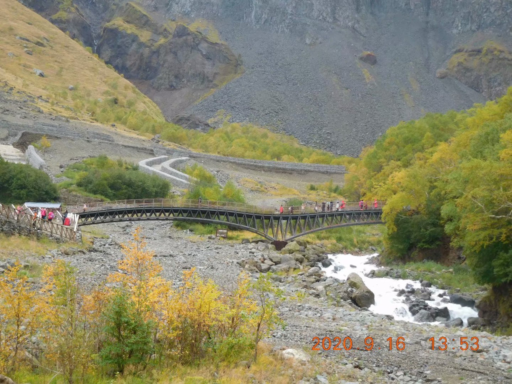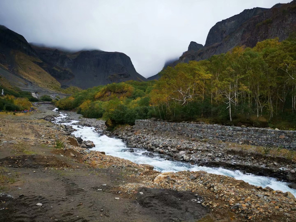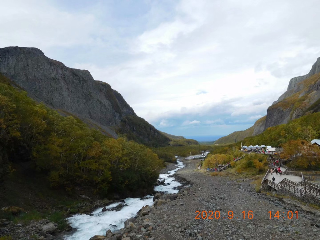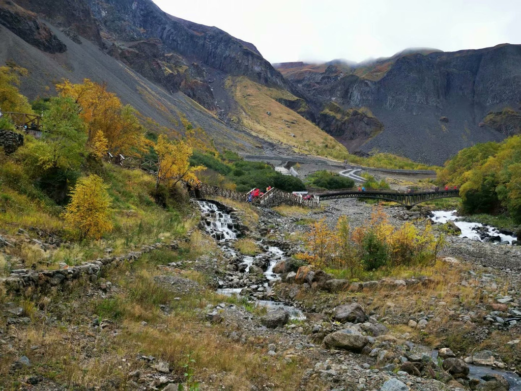 下车后还要走好长一段路,都是楼梯,期间还要走过一座木桥,山风强劲,吹着你走,一切都在风中凌乱,不一会还下起了大雨,狂风大雨让你行走更加艰难(幸亏租了件棉衣,可以冒雨前行),好在沿途火山特有的地貌很美丽,瀑布形成的小河水势湍急,山上的树木黄灿灿一片,美景可以打消你的疲惫。