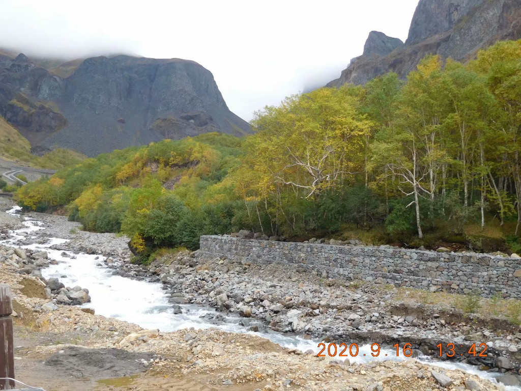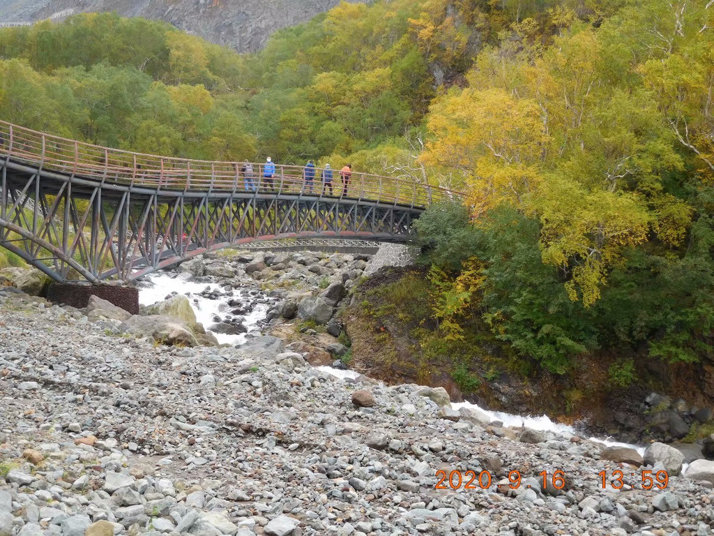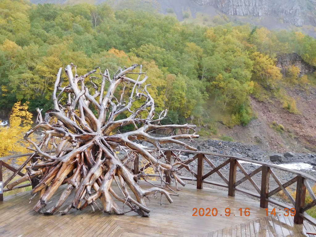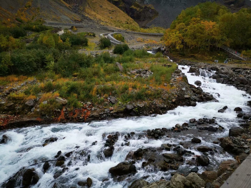下车后还要走好长一段路,都是楼梯,期间还要走过一座木桥,山风强劲,吹着你走,一切都在风中凌乱,不一会还下起了大雨,狂风大雨让你行走更加艰难(幸亏租了件棉衣,可以冒雨前行),好在沿途火山特有的地貌很美丽,瀑布形成的小河水势湍急,山上的树木黄灿灿一片,美景可以打消你的疲惫。
