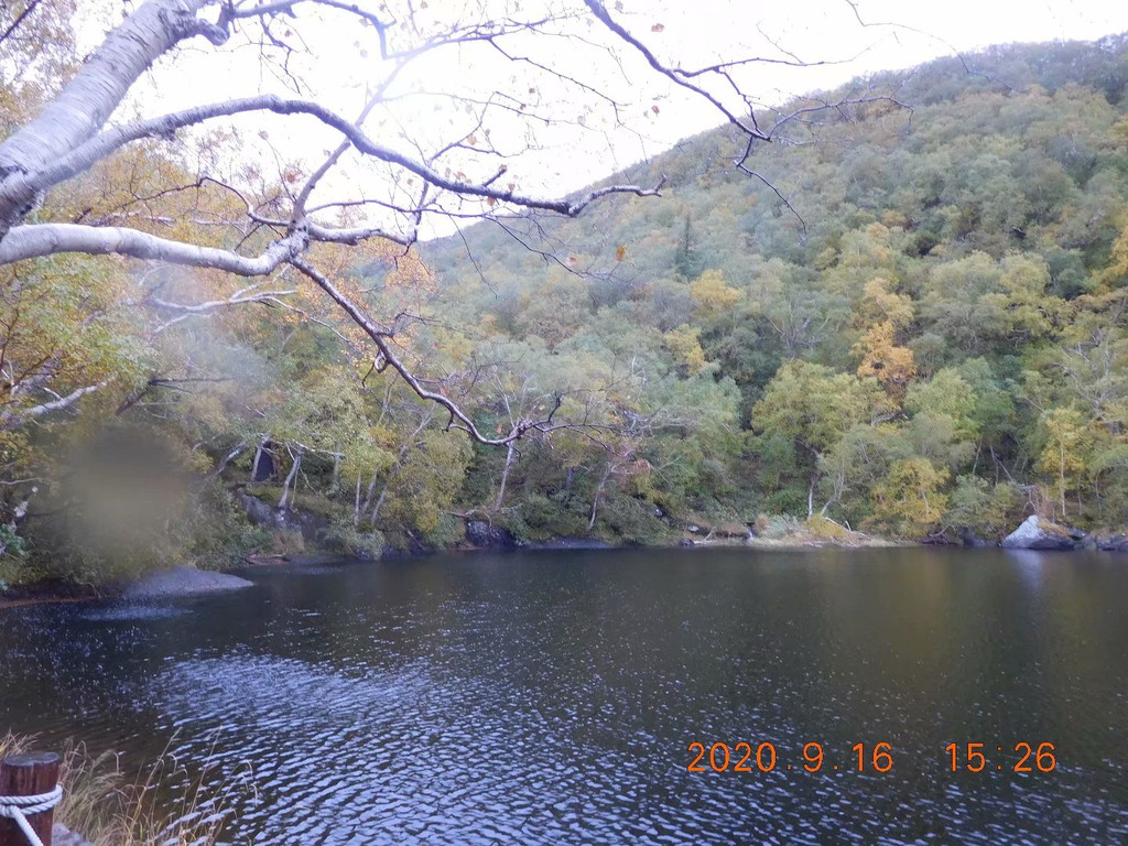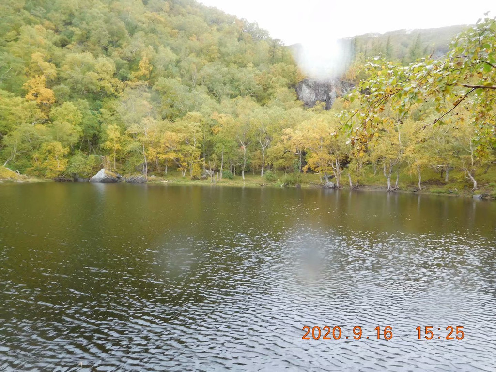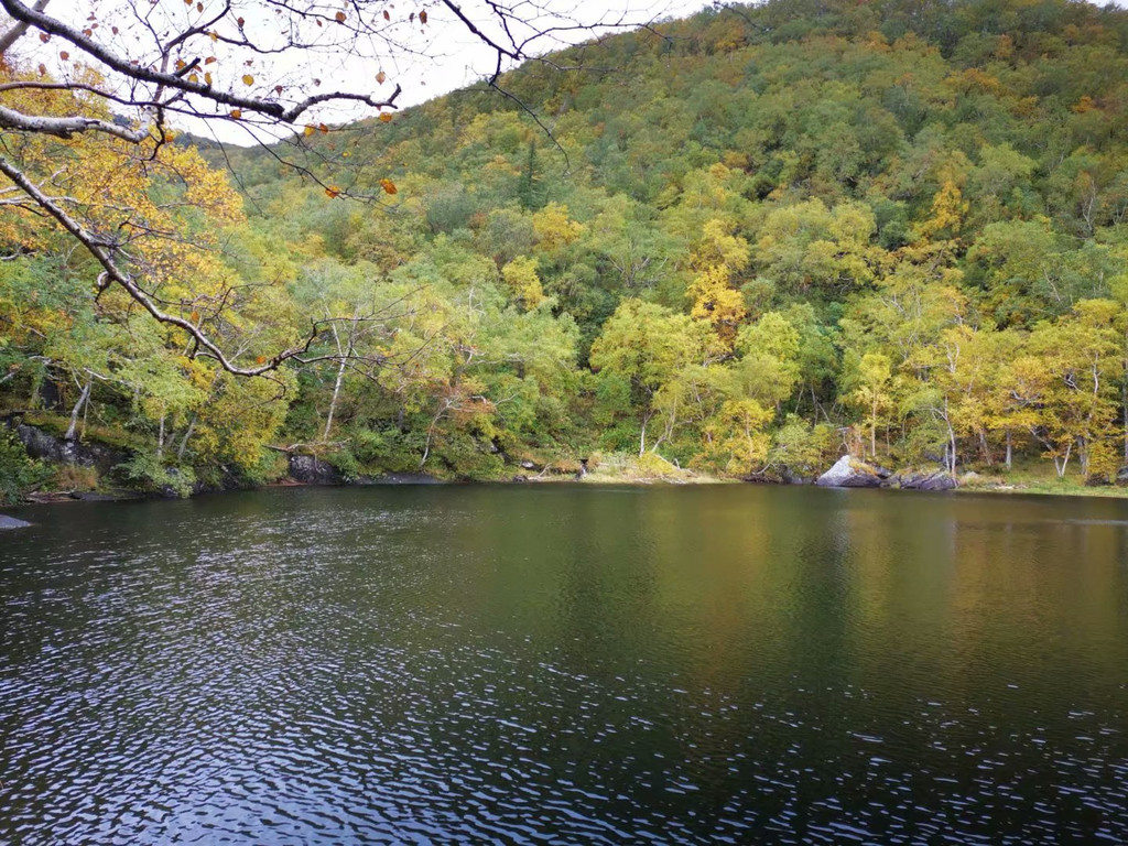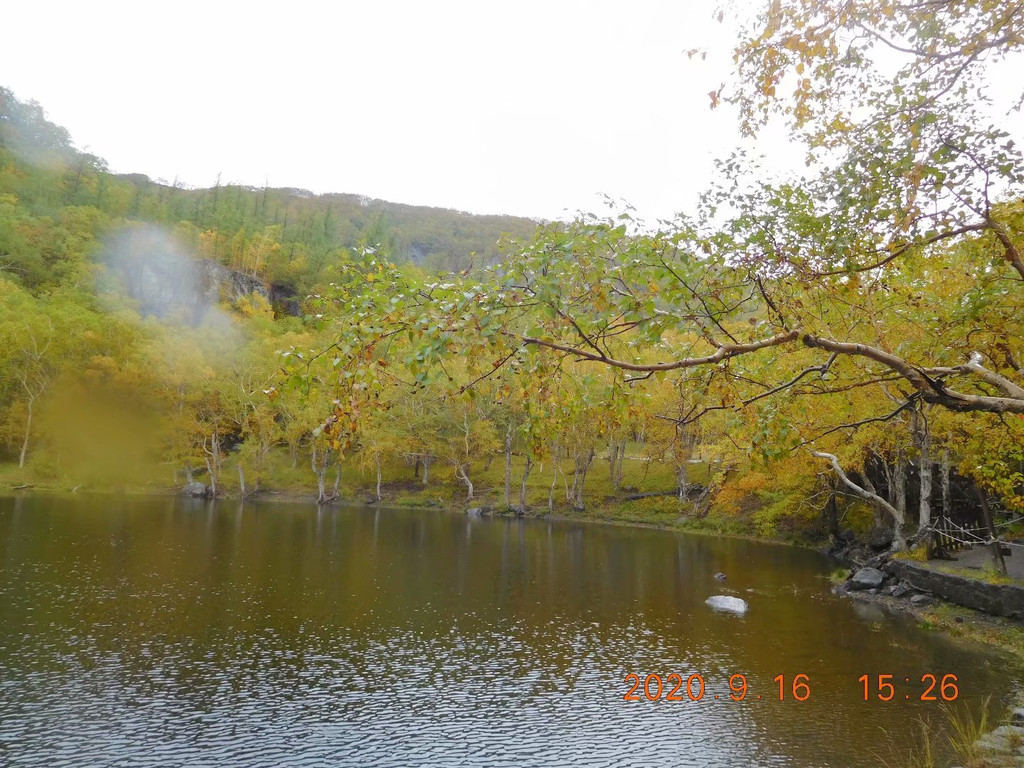 绿渊潭水体幽深、水面舒展,融蚀着周围岳桦树的荫绿,形成了一块温润的和田碧玉,幽绿泛蓝,镶嵌在寂静的山峦中;水中生有金鳟、红鳟等冷水鱼类,穿梭游动。潭面薄雾轻浮,人行栈道时隐时现,如临瑶池仙境。绿渊谭的瀑布比长白瀑布小很多,但因为可以比较近距离的接触,感觉景色也很美。