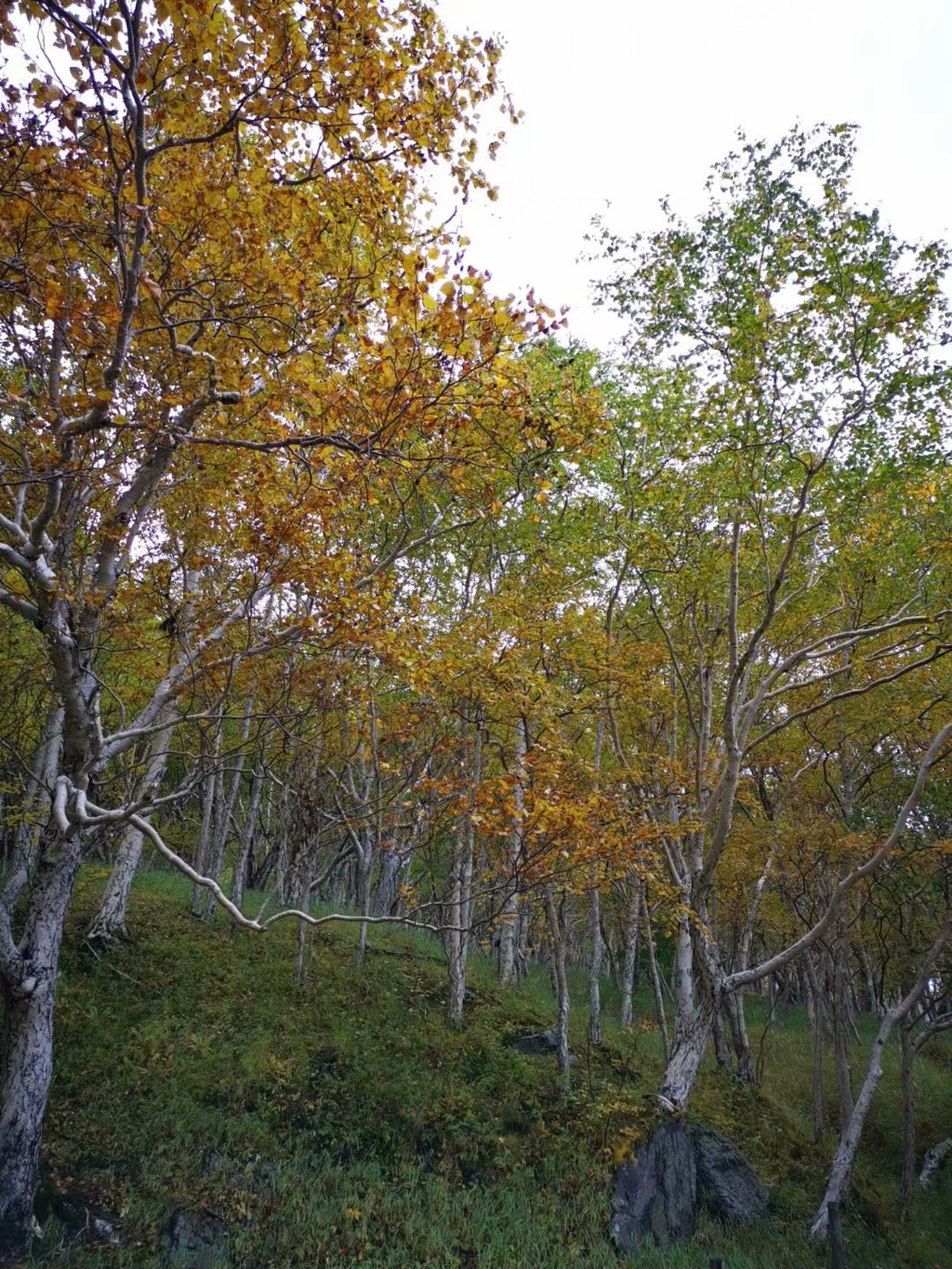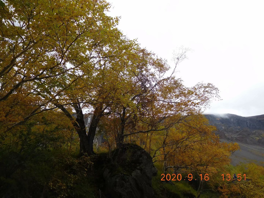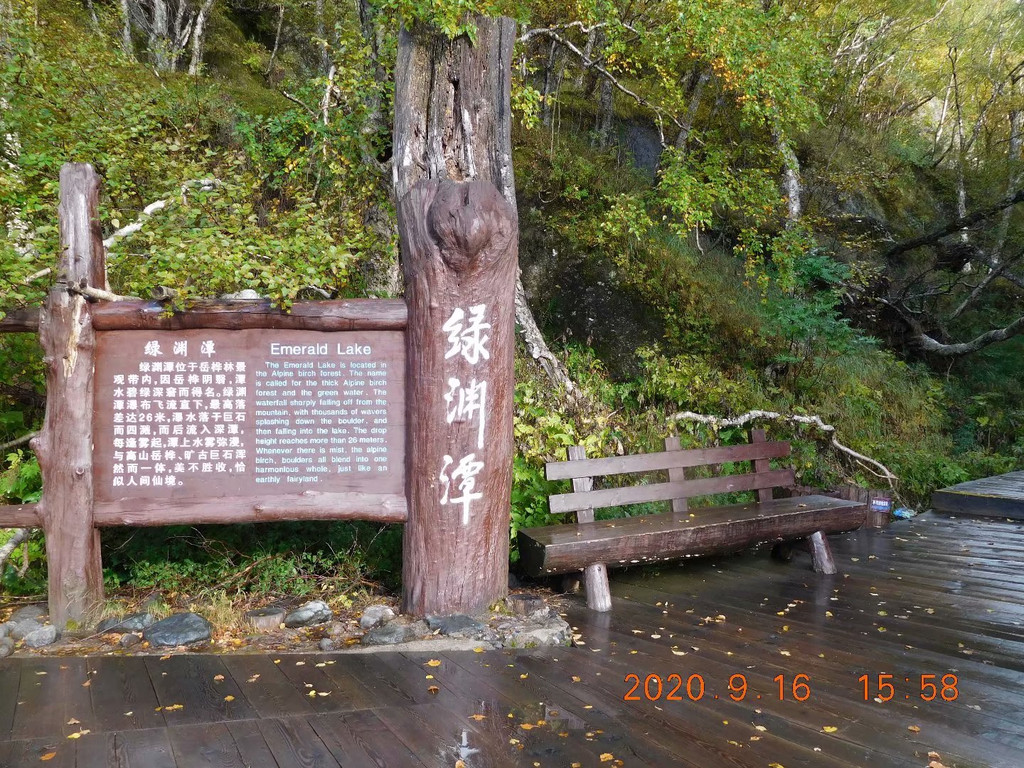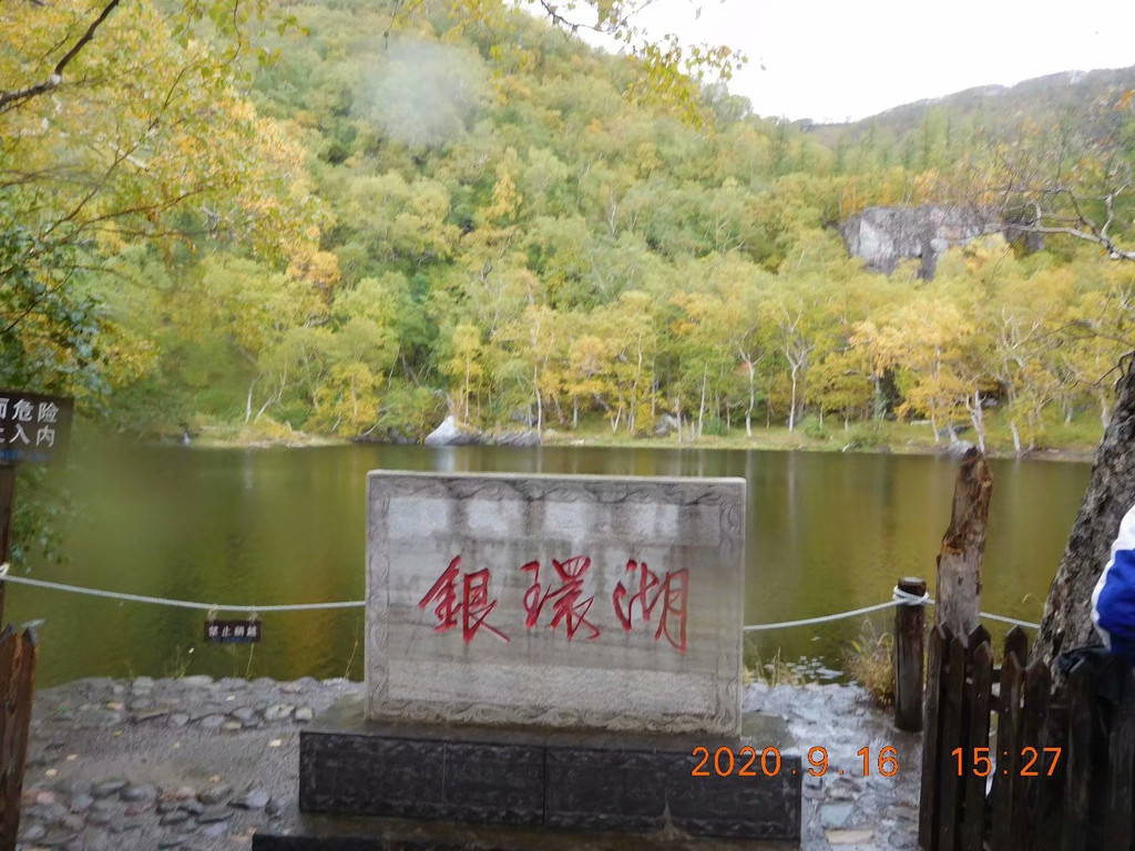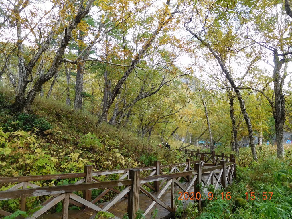说句废话,如今景区都流行观光车、环保车,不让私家车或旅游大巴开进来,除了保护景区环境之外,当然有经济利益存在。坐上景区的环保车,车道两边林木茂盛,随着海拔的升高,由针叶林带逐渐过渡到岳桦林带。成片成片的树林,变黄的树叶,黄叶和绿树互相映衬,很是好看。