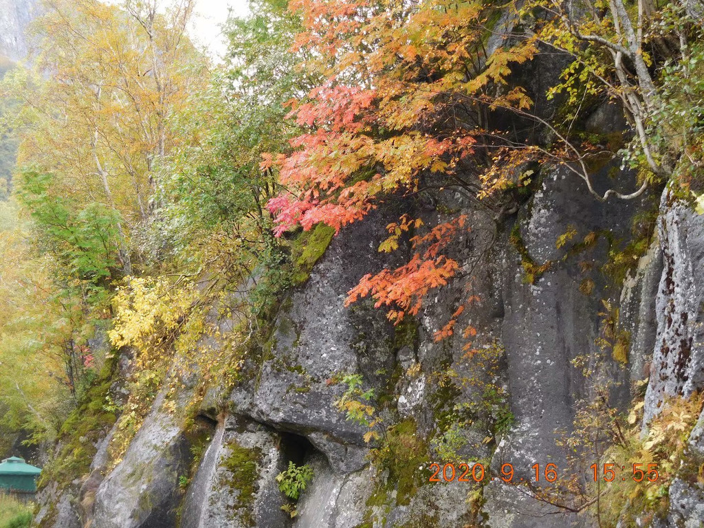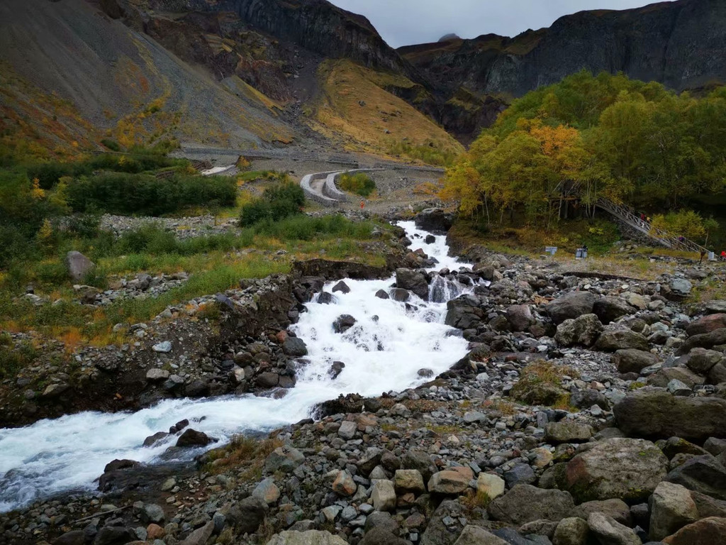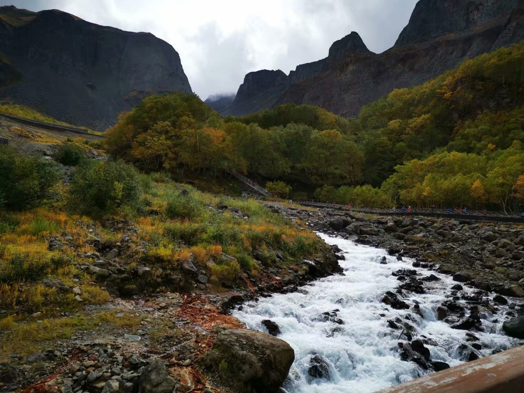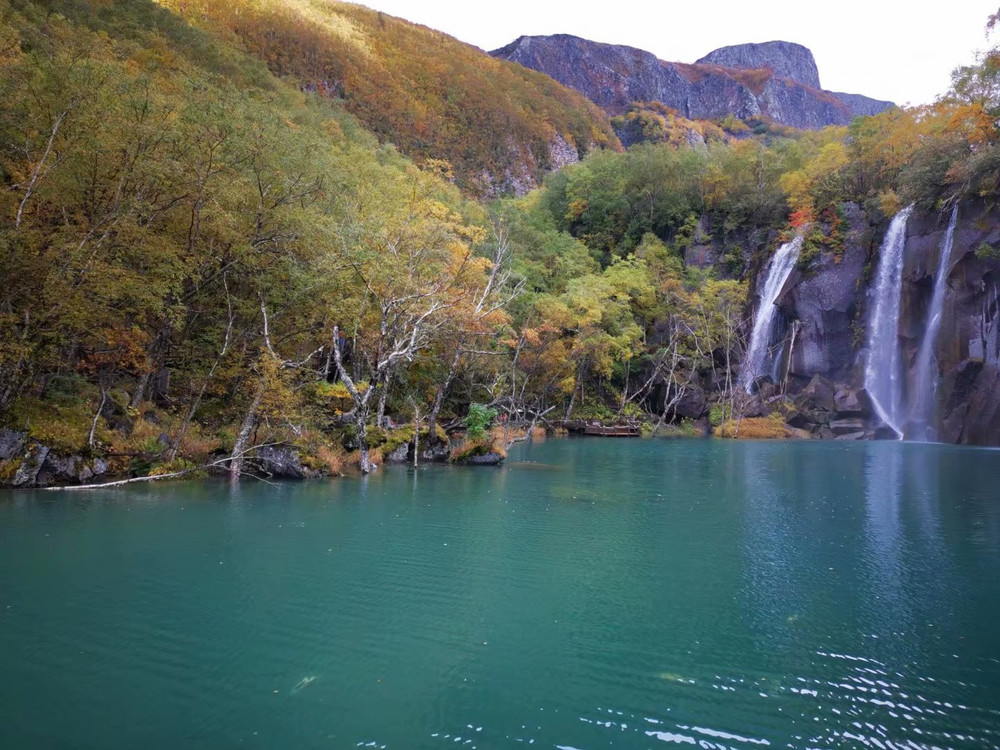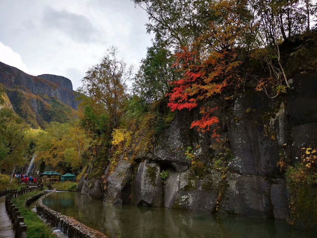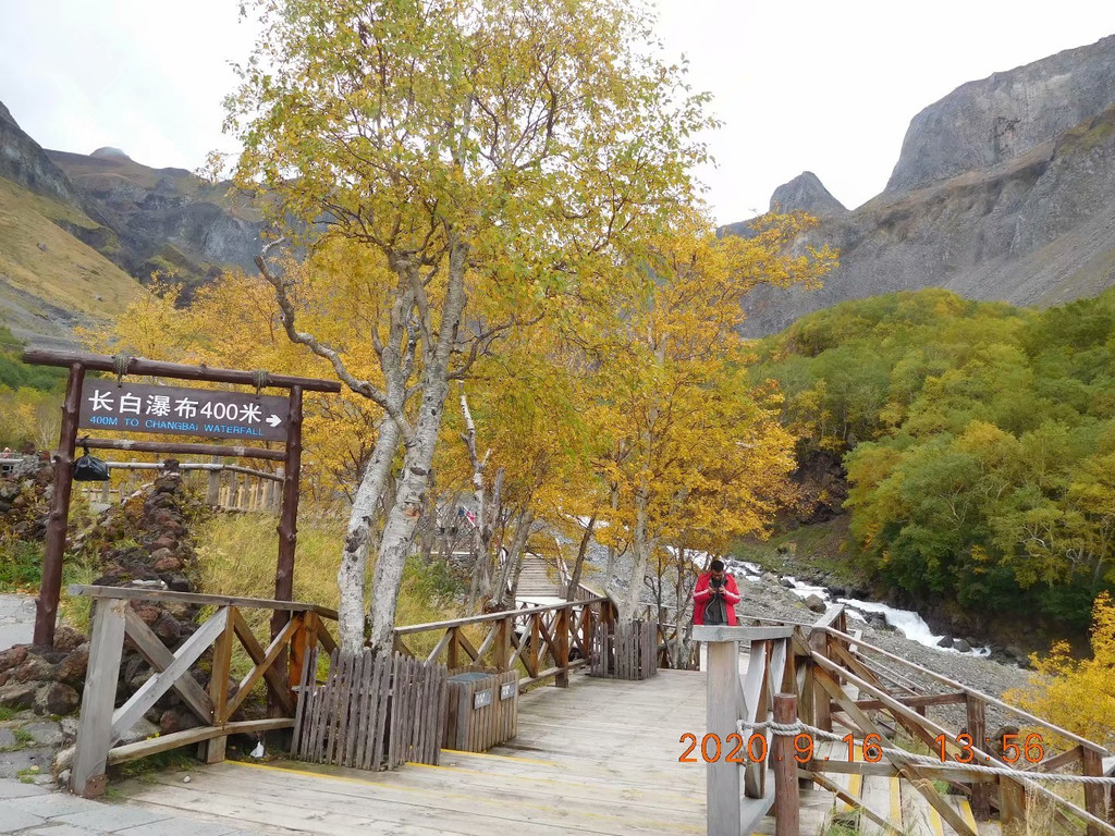 长白飞瀑景点的树木一片鹅黄,外加些许绿色、红色点缀,忍不住多拍几张。