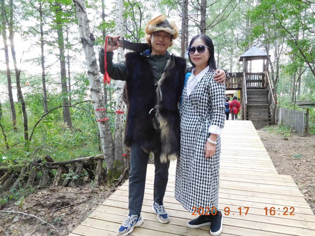 讲解员带着我们继续前行,在郁郁葱葱的原始山林里行走,走过桦树林,林间有各种药材,还有木耳等等,忽然听到一声喊:“绺子来了!”只见这条木栈道的尽头,窜出一个穿着皮毛背心,背着大刀的“土匪”,他喊了句:“天灵盖地虎”,其中一团友说了下半句“上山打老虎!”把我们笑坏了。土匪说:“应该是宝塔镇河妖!”之后是很多人和“土匪”合影,土匪高兴坏了:“咋全都是女的耶,我赚大了,抢一个去……”