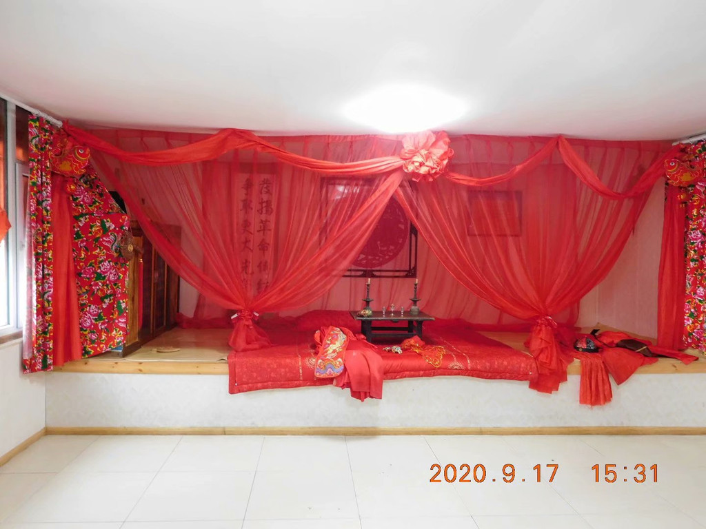 新郎新娘穿的都是大红色,新房也是红彤彤的。