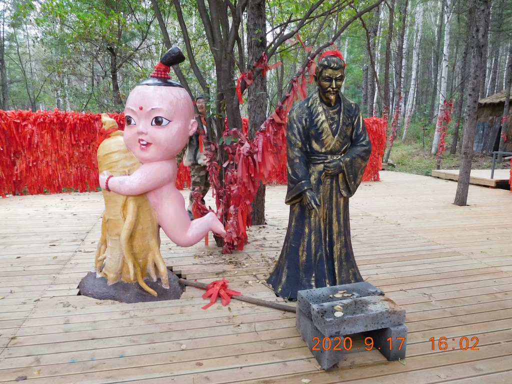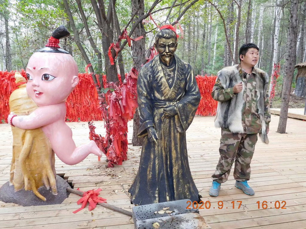 这就是放山人的老把头,祖师爷孙良的塑像,年轻的把头在讲孙良的故事。