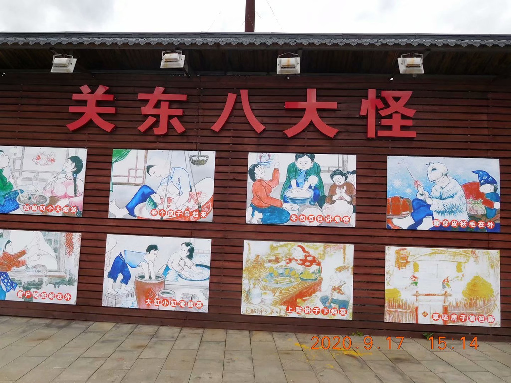 先来到一个广场,打算坐马车进山里挖人参,放眼望去,今天游客真多,所有马车都载满游客进山了了,我们只好临时调整了游览顺序,先去参加满族的婚礼。趁讲解员打电话联系的功夫,我看着墙上的东北八大怪的图示。