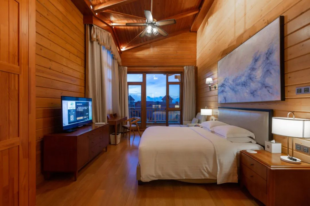酒店客房室内家具使用了返璞归真的原木,保留了部分原生态风格,天然亲切,宽敞的全落地窗设计,将窗外的景色带到室内,宾客可以透过玻璃窗,可远眺长白林海和滑雪场。