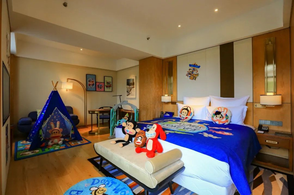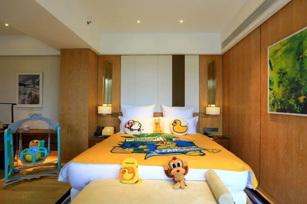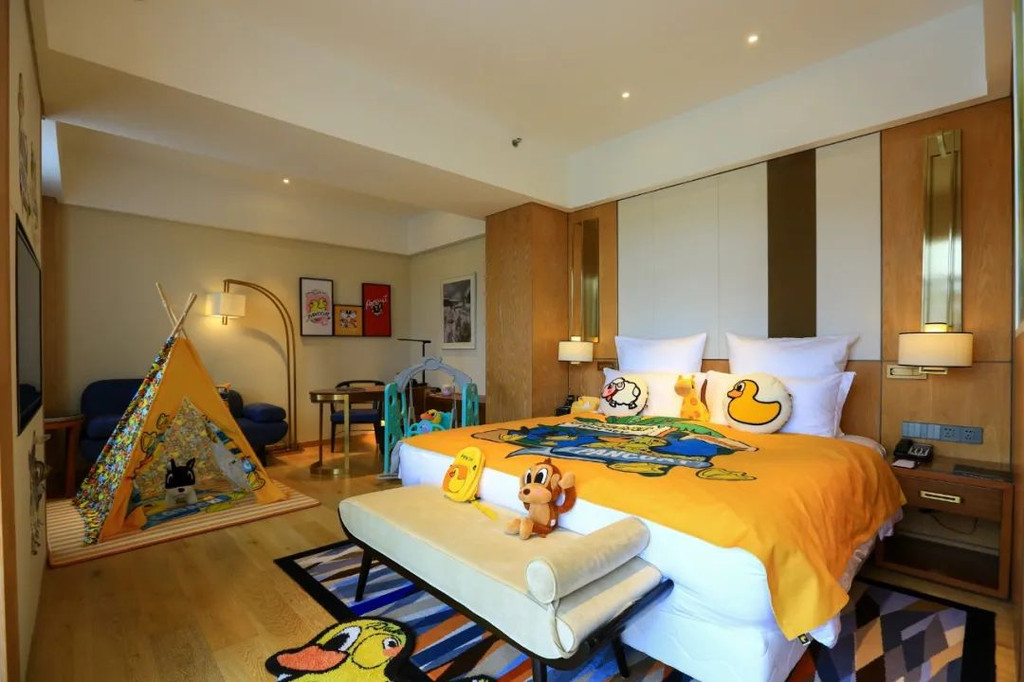 酒店还为亲子家庭精心打造了大嘴猴、小黄鸭两种儿童主题客房。客房专为亲子家庭定制了包含落地帐篷、趣味互动飞行玩具,还有图书、拼图、儿童洗漱用品等。