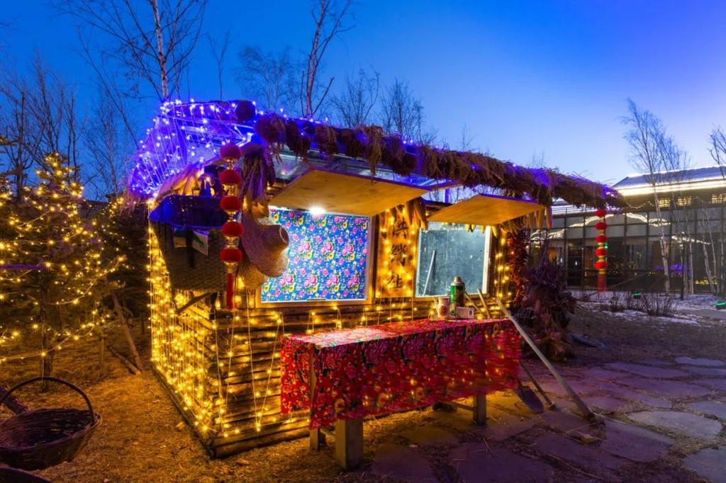 冬天的庭院里面增加了供销社,白天像极了80年代的东北集市,特别有趣。在一声吆喝一声叫卖中,仿佛穿越回到20年前的场景,这里还摆放有冰冻的雪梨和一些其他水果。到了夜幕降临,华灯初上,经过灯光装饰的供销社,又是一种特别炫的氛围。