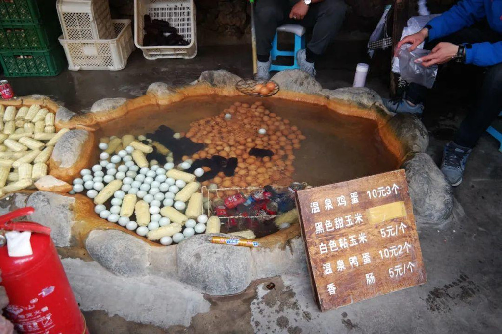 温度这么高,洗手会烫,用来煮鸡蛋或玉米则刚好,而温泉水中含有人体所需的多种微量元素和矿物质,使得煮出的食物更具营养。所以温泉鸡蛋成了这里的香饽饽,大部分游客都会品尝一下。