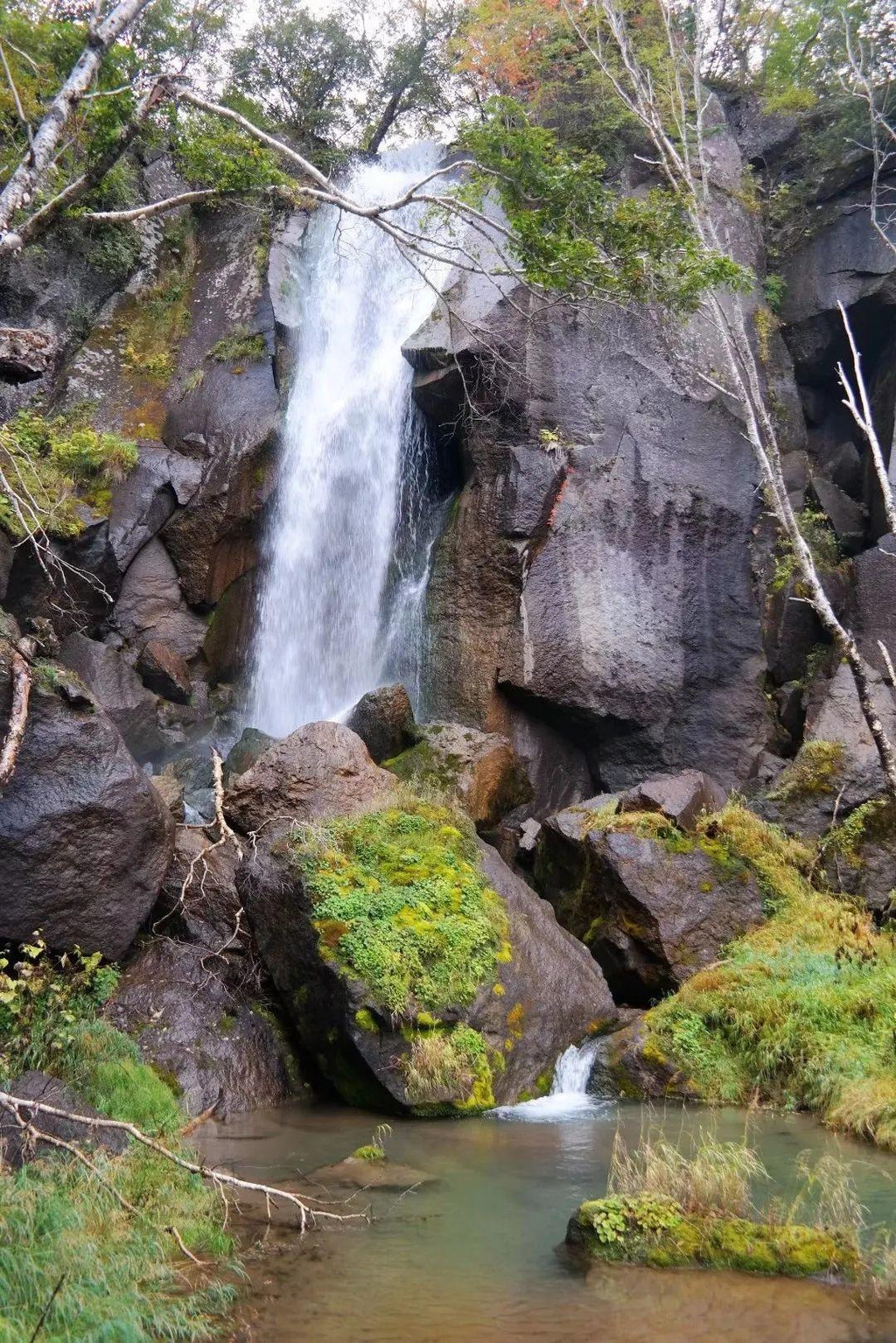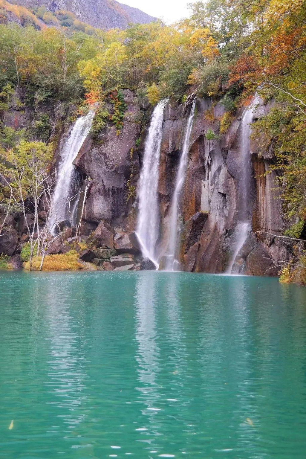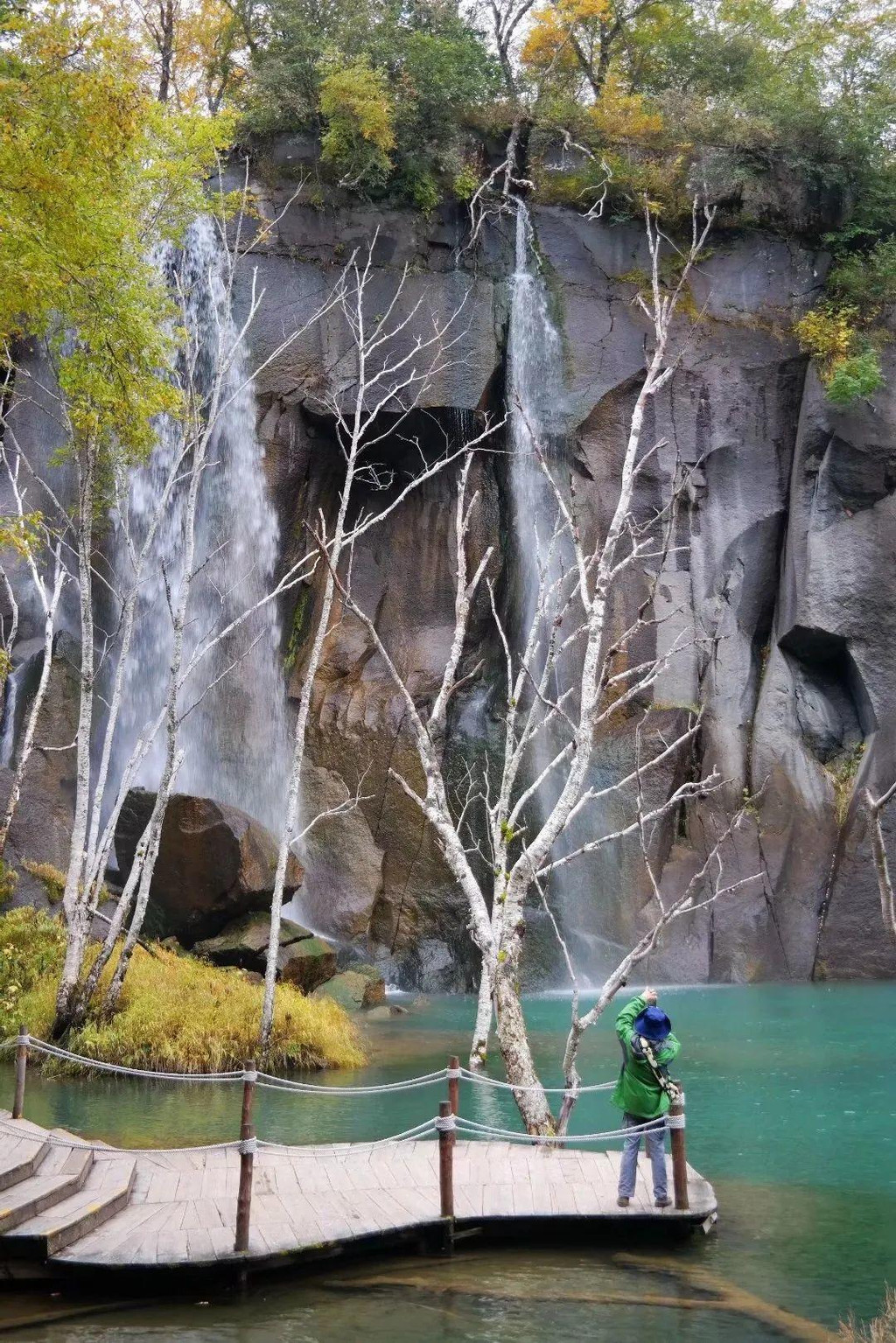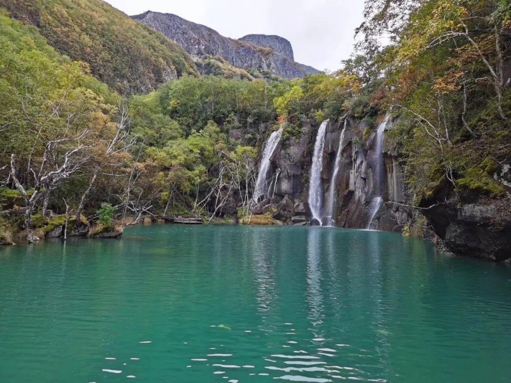 长白瀑布不是北坡上唯一的瀑布,自此出发沿二道白河向北约2公里,还有一处美不胜收的瀑布,它没有长白瀑布那么气势磅礴,却鲜艳秀美到让人由衷赞叹,它就是绿渊潭瀑布。