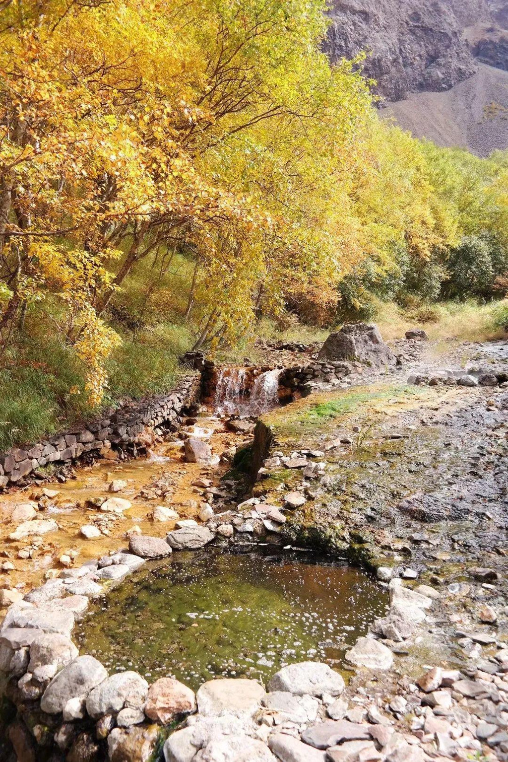 秋天的聚龙泉是一幅五彩斑斓的油画,浓艳的不仅是高处的黄叶,还有地面的苔藓,以及红褐、翠绿、幽紫、金黄的矿化层,和硫化氢晕染在青灰火山岩上的橙红和翠绿凝华,一起表达出秋天最丰富最温暖的魅力。