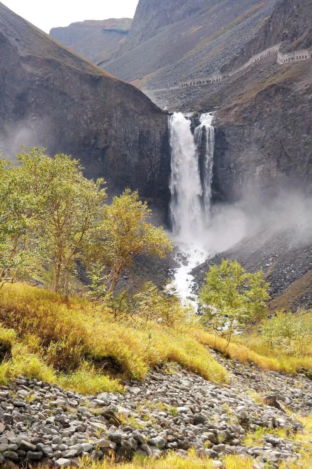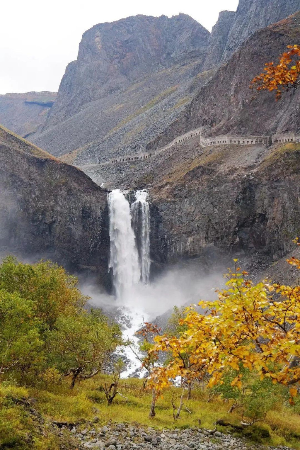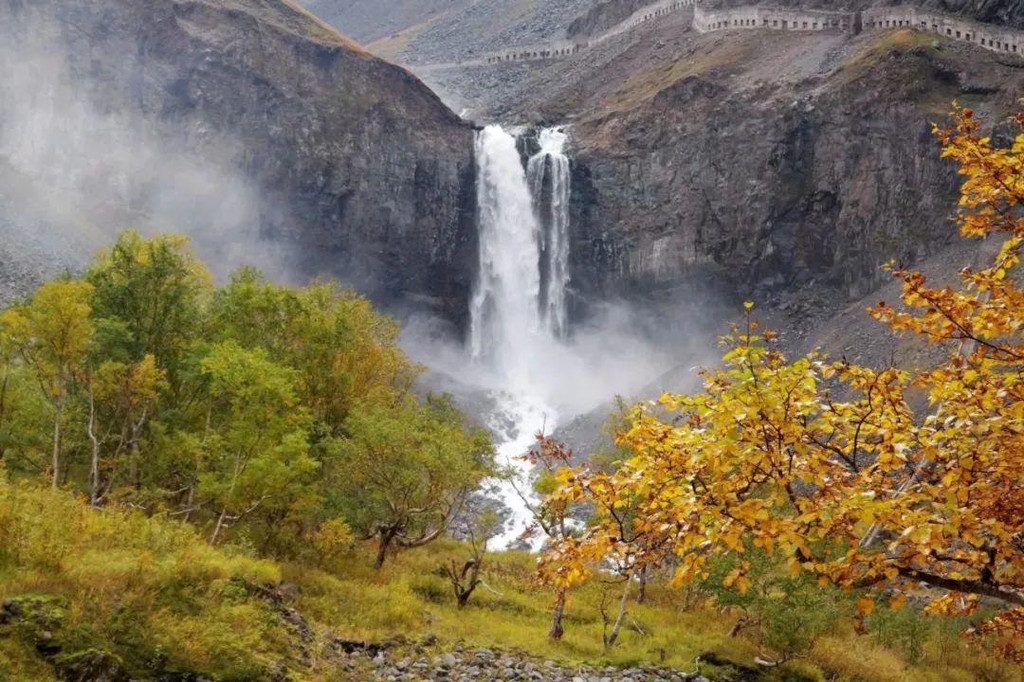 再往前,巨响的源头出现在秋色掩映的远方,游客无法走到瀑布脚下,此处是离瀑布最近的观景台,尽管没有贴近,但瀑布的气势依然扑面而来。68米的落差让水柱如咆哮的雪龙俯冲而下,声音如雷贯耳,溅起浪花无数,水汽弥漫如飞雪漫天,清秀的秋色中和了粗砾的壮观,形成了一幅绮丽又宏伟的画面。
