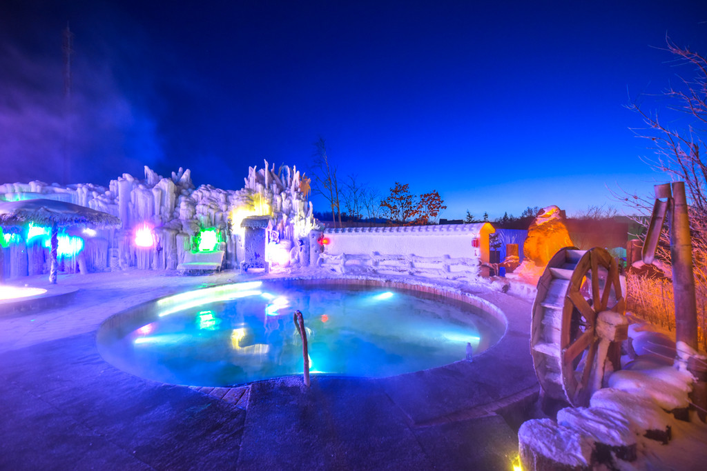 夜幕之下,五彩斑斓的汤池夜景,十分迷人。不过说到聚龙泉,你要知道——聚龙泉温泉带,泉外雪花飘飘,泉中热气缭绕。远远望去,温泉腾起一片云雾如是长白山的神秘面纱。出水温度达到82摄氏度的聚龙泉,几乎供应着二道白河镇上所有的酒店温泉用水。