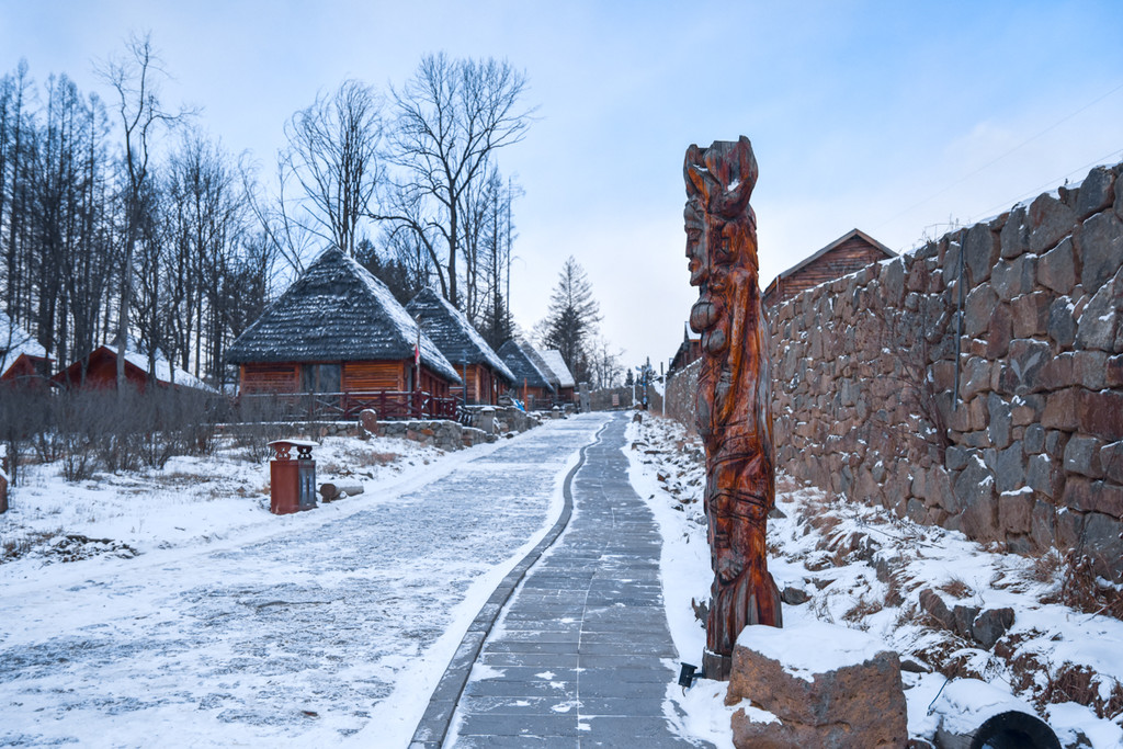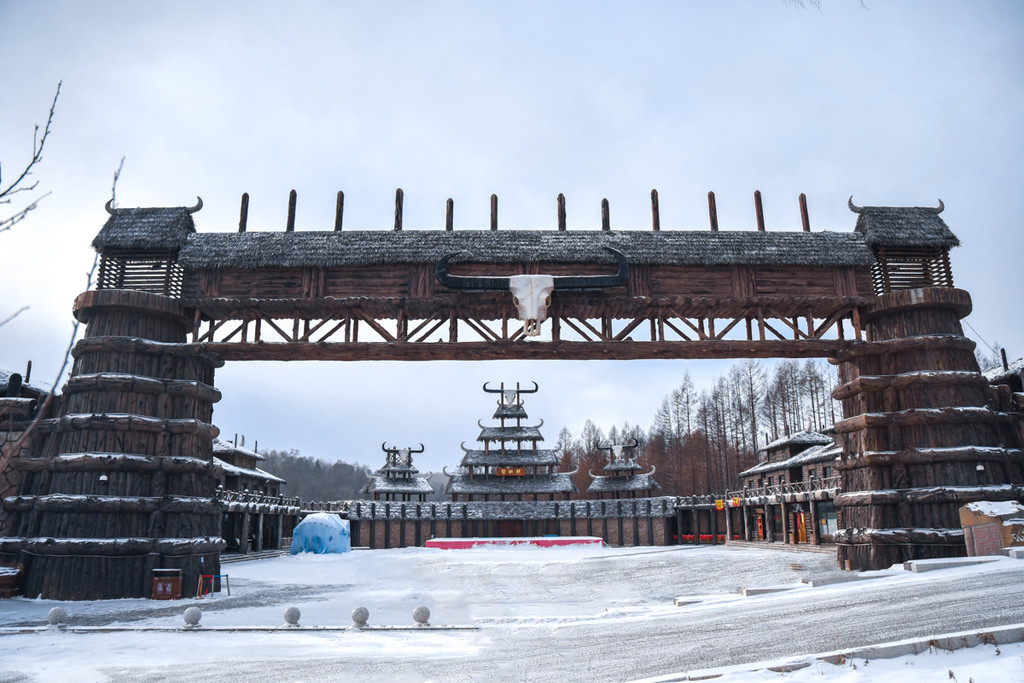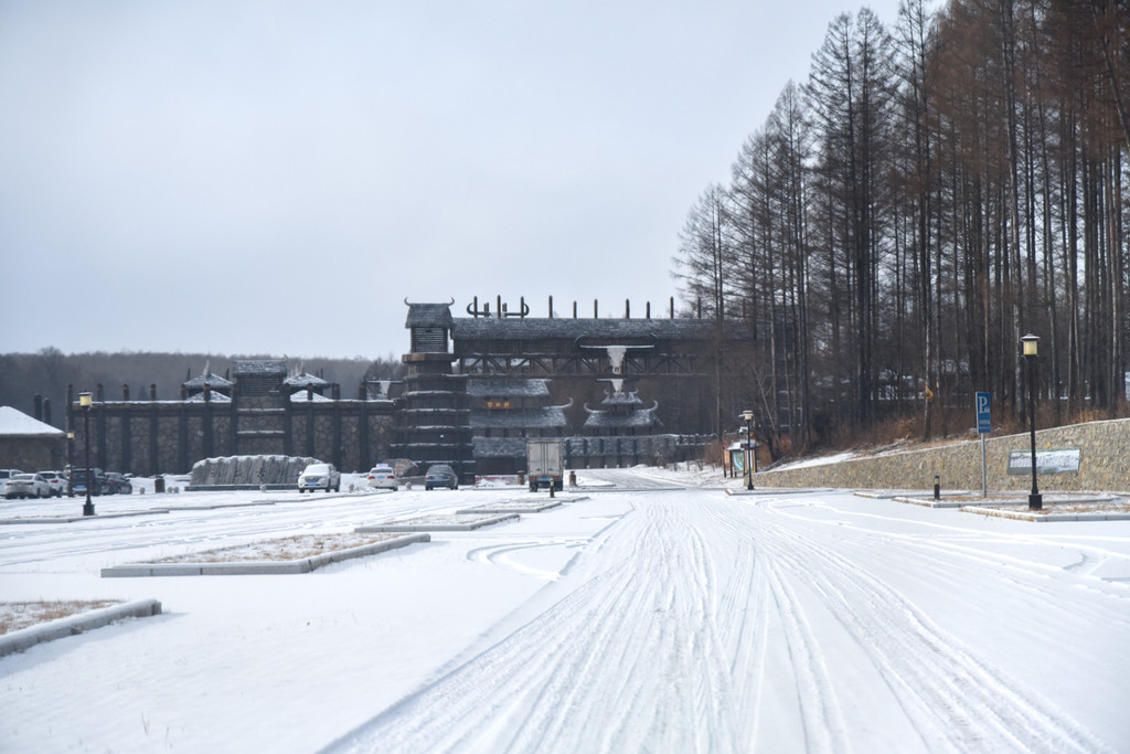 讷殷古城,位于长白山池南区锦江和满江交汇处,国家4A景区。抵达景区停车场前,转弯的第一瞥让我惊讶,恒大冰泉矿泉水,生产地就在这不远处。后来我才得知,长白山是世界三大矿泉水产地之一。气势恢宏的景区大门,极有历史古装剧军营的威严气息。别看广场白茫茫一片,其实这雪质,比南方雪质更干燥、细腻,东北冬季极少下雨,所以积雪重压之后,不滑。踩在上面,伴有清脆的咯吱咯吱的声音。