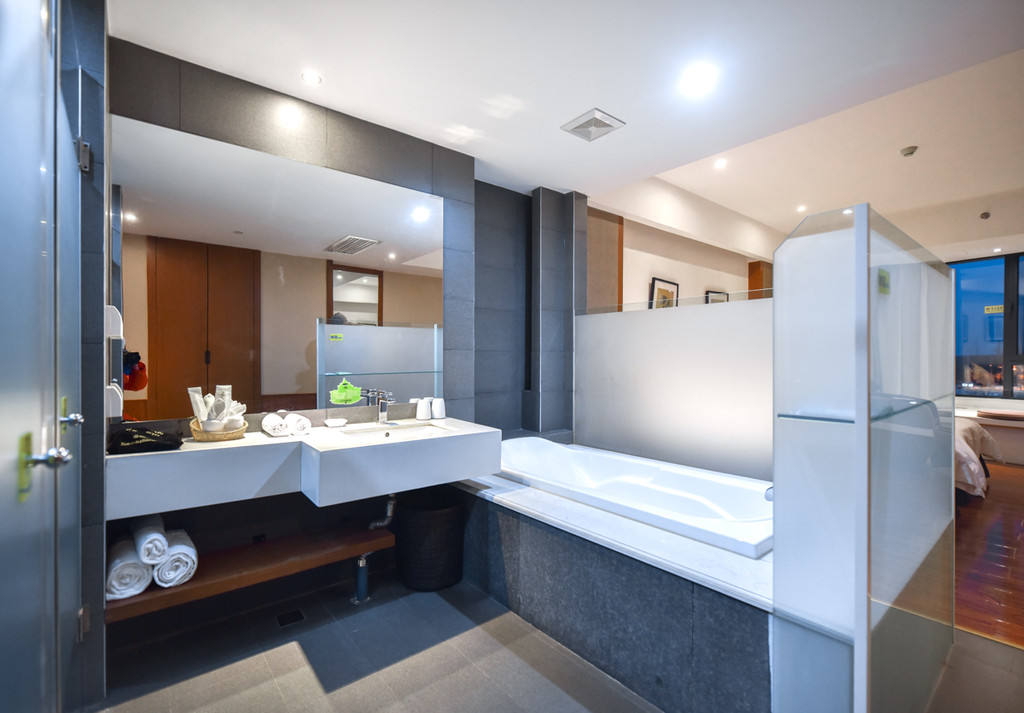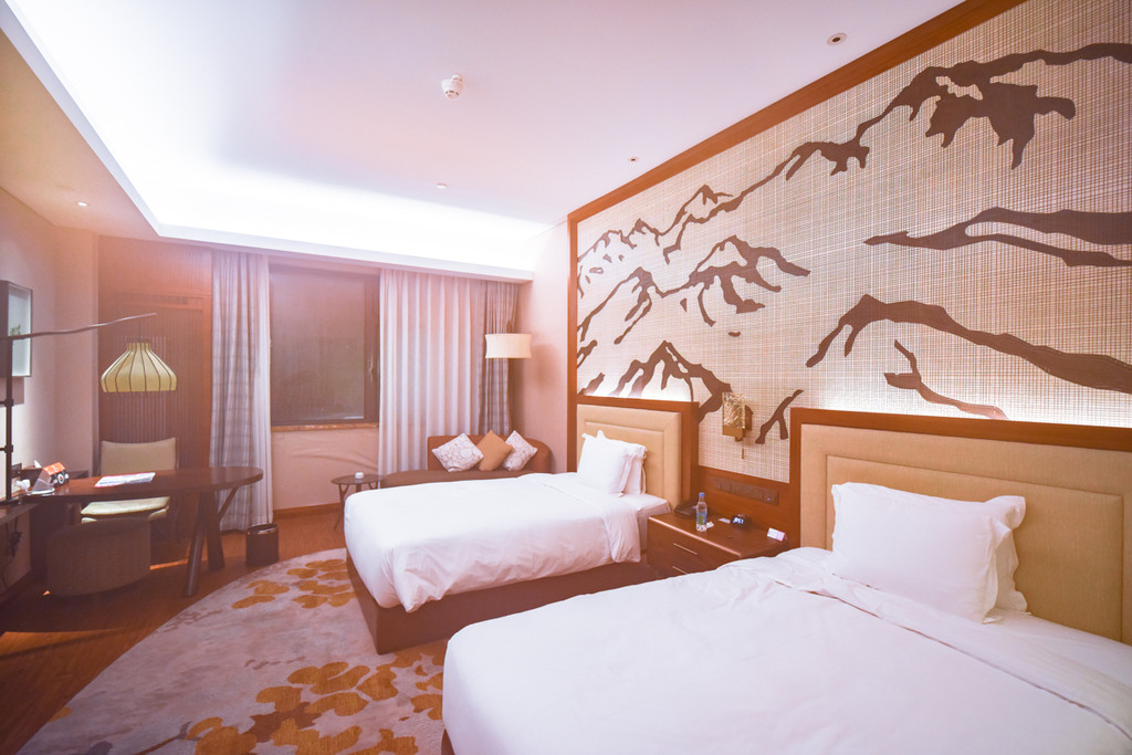 酒店客房中式风格为主,酒店采用地暖,因而夜晚睡眠无忧,且不会上火。客房面积不是特别大,但布局合理,办公桌、干湿分离卫生间、行李室、独立卫生间都有~客房洗护用品均为一次性,酒店床品非常舒适,亲肤性很好。