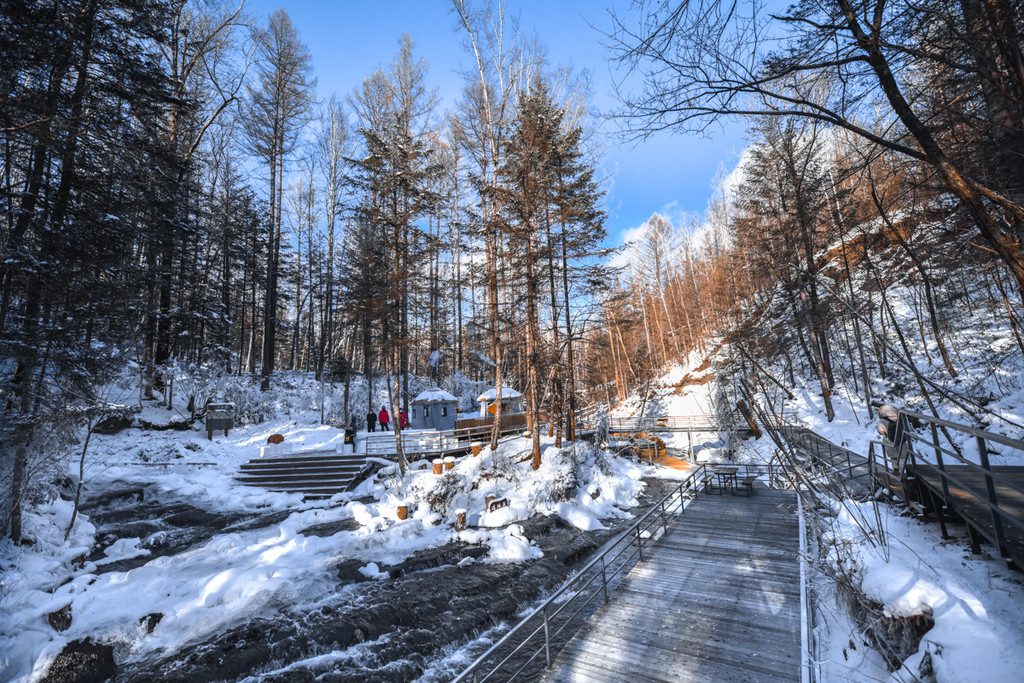 景区古木参天,栈道逶迤,斜阳灿烂,泉水叮咚,鸟儿掠过林海,非常静谧安详。景区入口在右,迎着栈道可往下抵达冰水泉溪道,在品尝完冰泉火锅后,再拾阶而上,迎着阳光,回到景区出口。全程无须走回头路,爬山也不累。冰泉处,还有一棵百年树根冰雕,比雾凇更震撼。