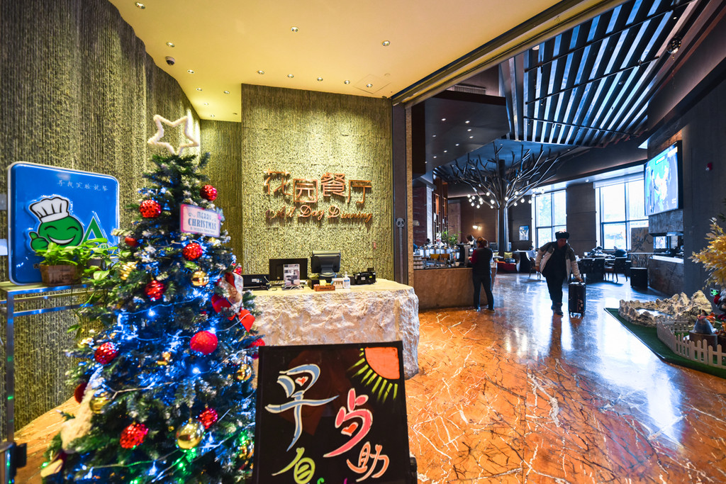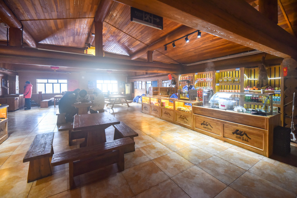 酒店自助早餐厅,非常丰富,在这冰天雪地、前不着村后不着店的景区周边,已然是非常美味。最佳景观位就是玻璃旁,早上9点日出阳光透过玻璃,直射餐桌。中式面食、西点、新鲜蔬果、热菜均有,还有当地非常有特色的延边羊肉汤。中餐彩丰楼在二楼,以东北菜为主,很有特色。
