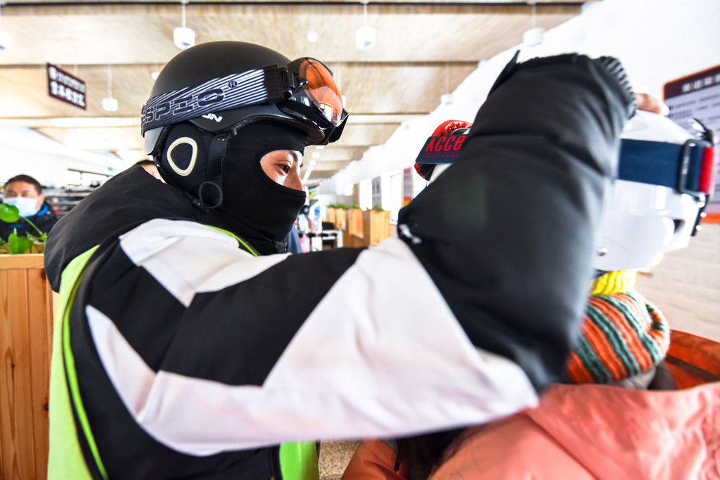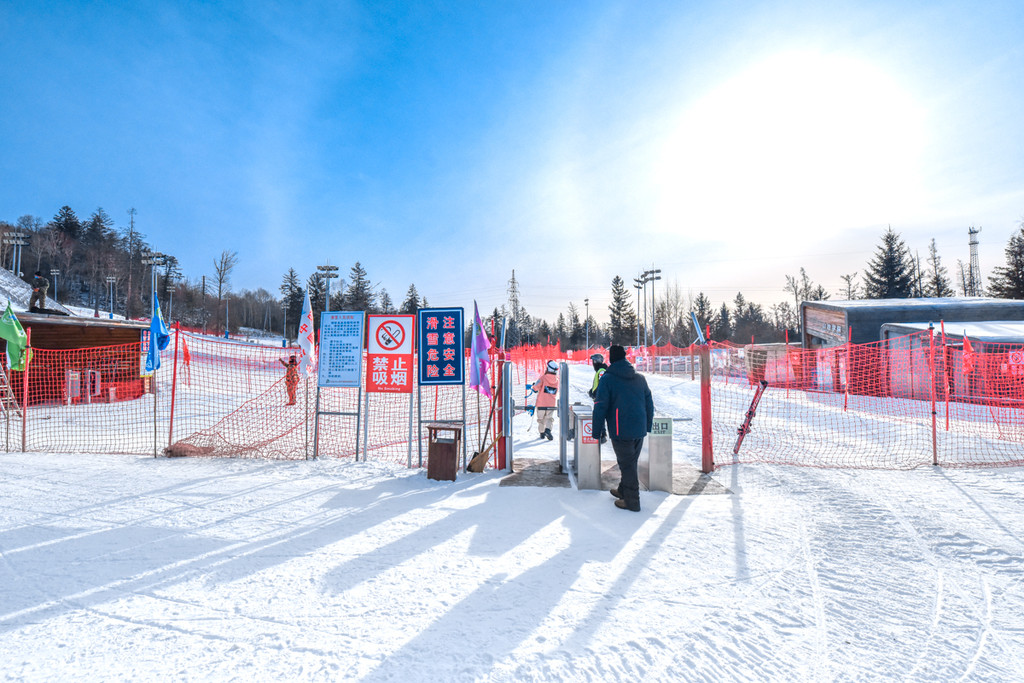 对于滑雪小白而言,这儿也是最好的课程体验基地。进入景区,有一些标识,必须了解。选择合适雪具(雪帽、雪镜、雪鞋、雪板)以及防护工具,然后寄存行李、更换装备,携带计时卡片,进入雪场内部。