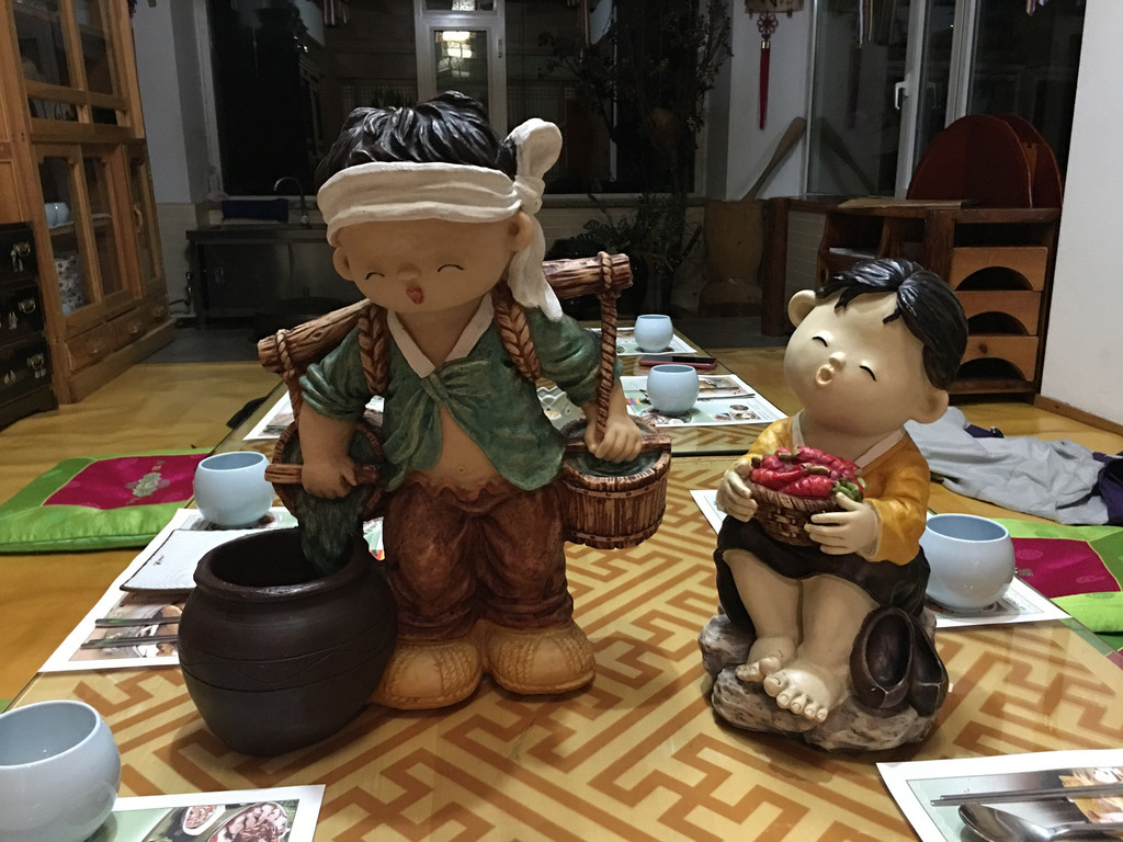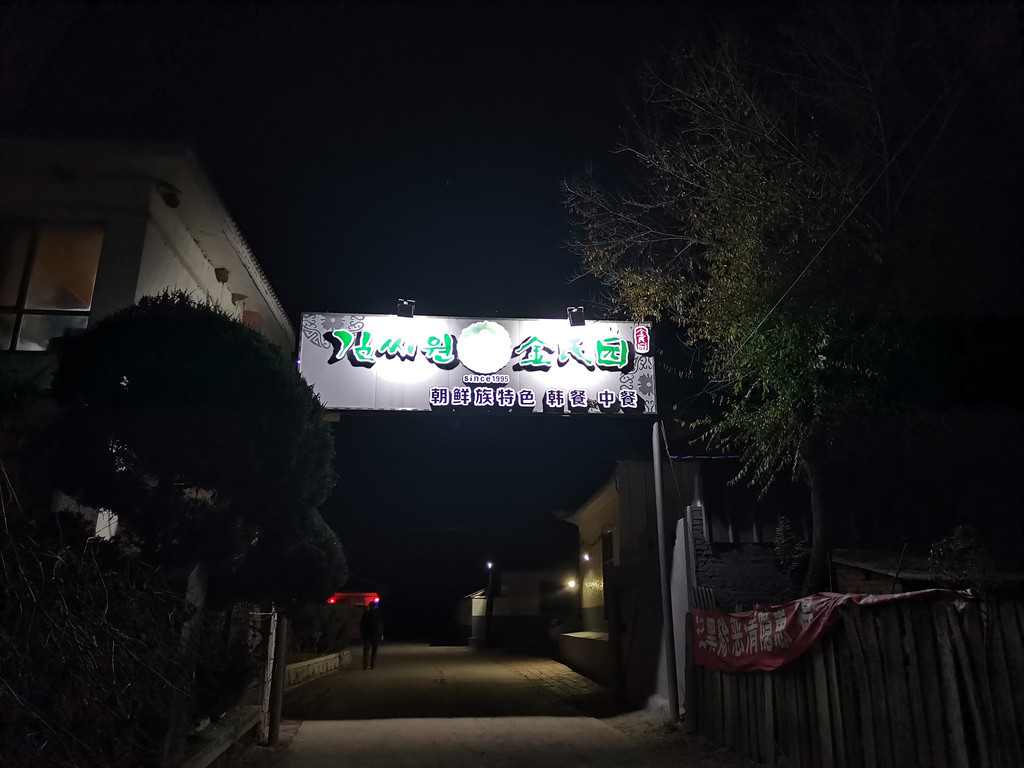 17:30到达餐馆,晚餐。(金氏园民俗山庄)走进去的小路并不远,但是漆黑一片,没有路灯,小路两边有民居,山庄在小路的尽头。