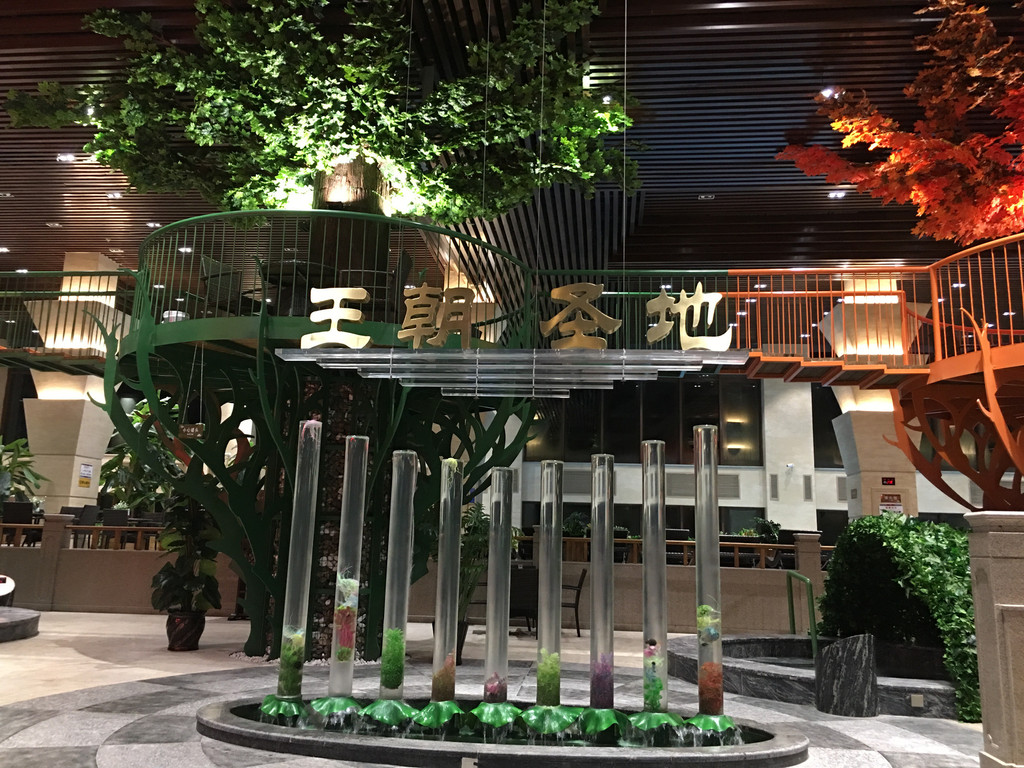 酒店客房以中式装修风格为主,王朝圣地温泉水汇超大规模6000余平,共有室内外汤池29个,汤池采用长白山天然温泉水,设有儿童儿童嬉水区、天然水疗池,汗蒸理疗体验馆,健身区,游泳区等服务区,一站式满足众多需求。