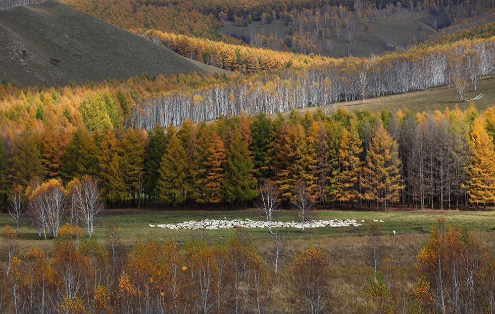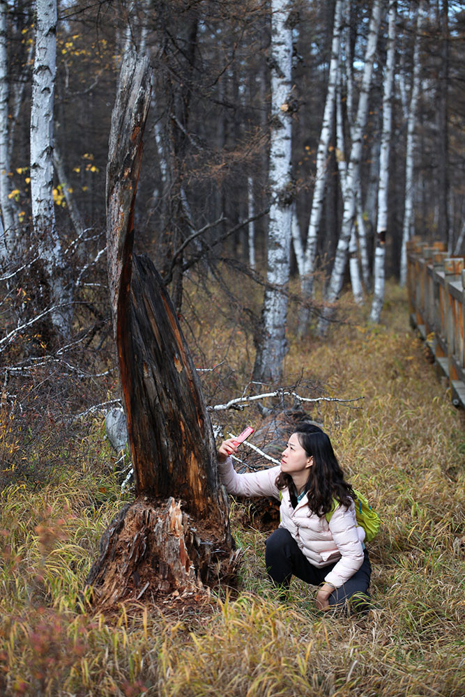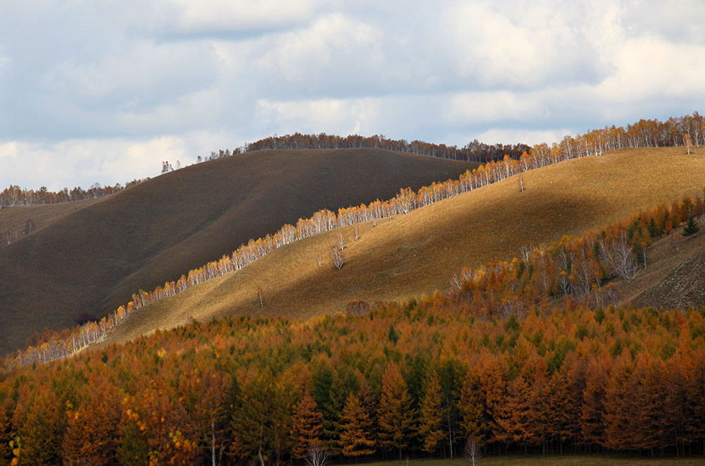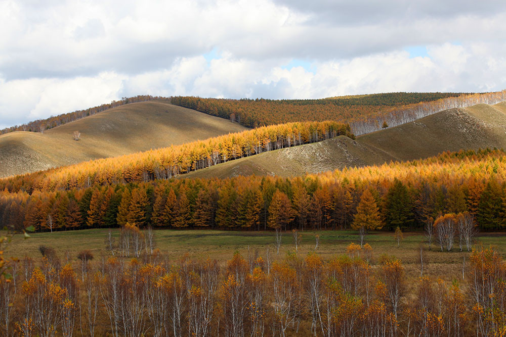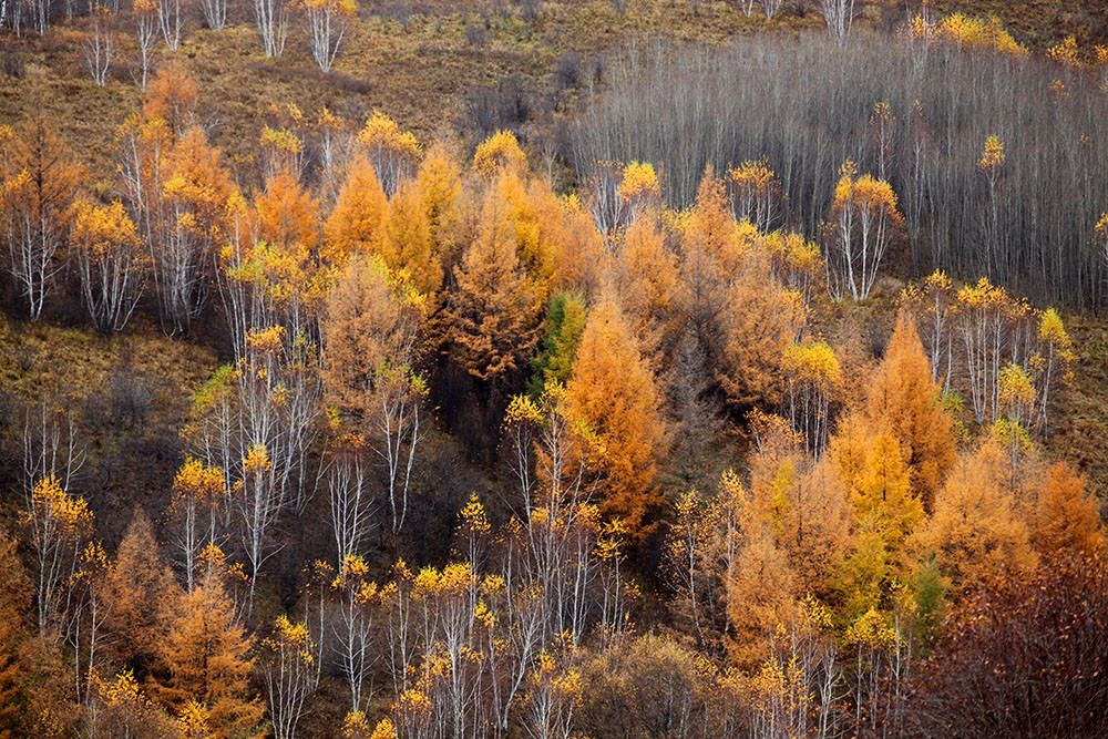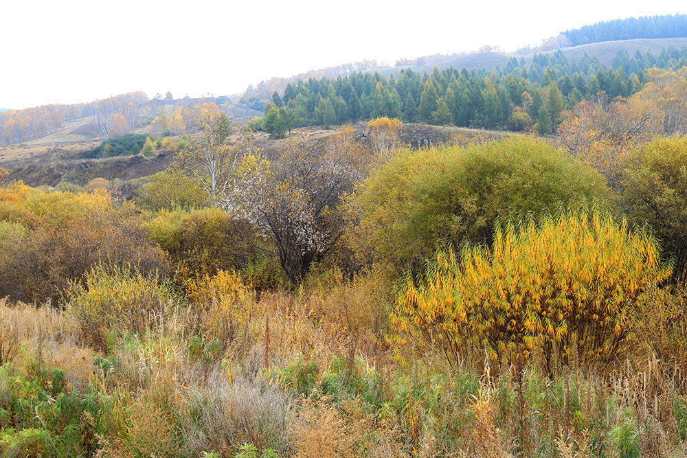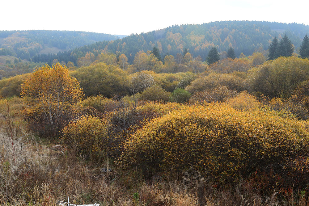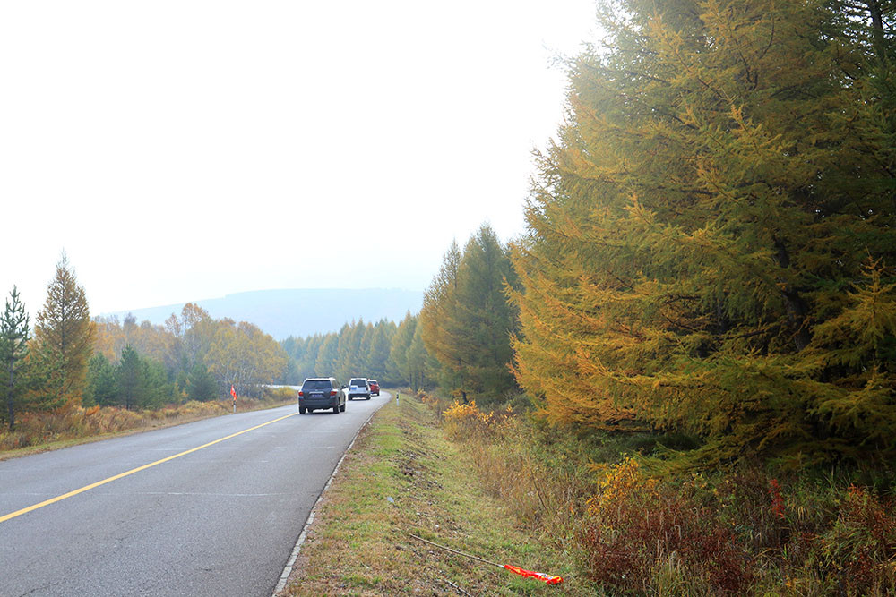快到阿尔山了,山沟里的落叶松绿中透黄,正是一年中最美的时候,大家占领有利阵地,各自寻找着自己满意的画面。