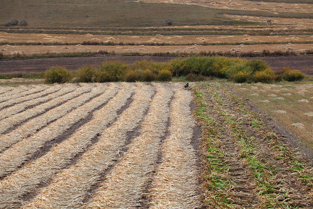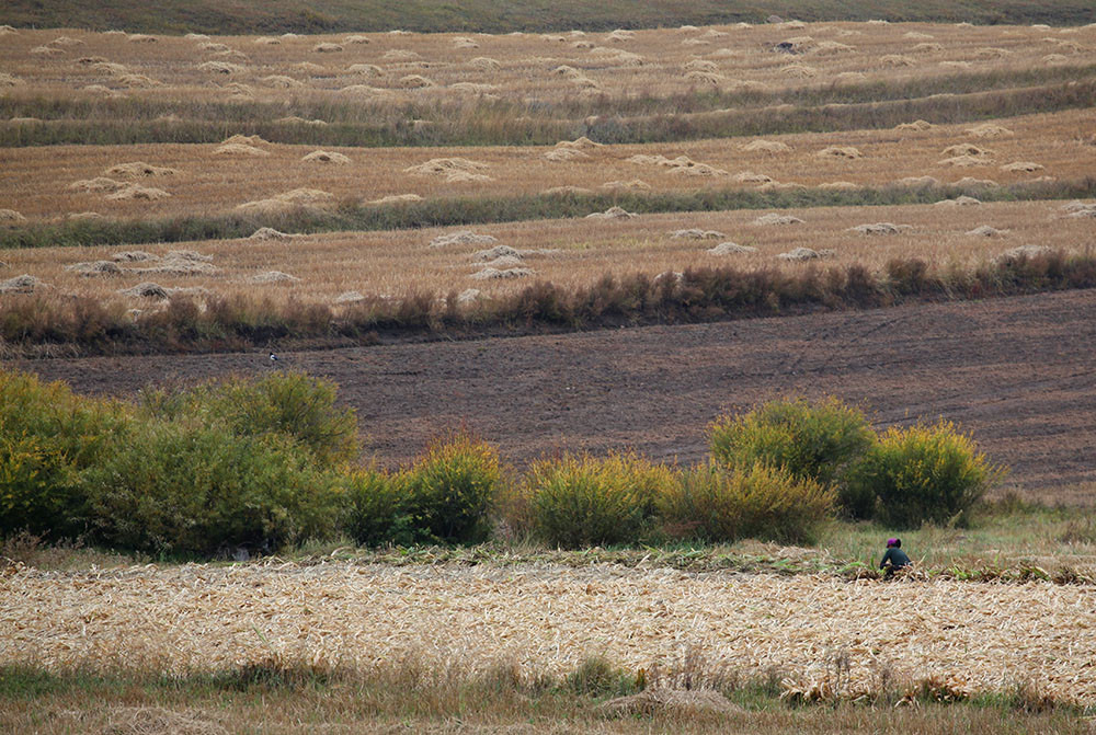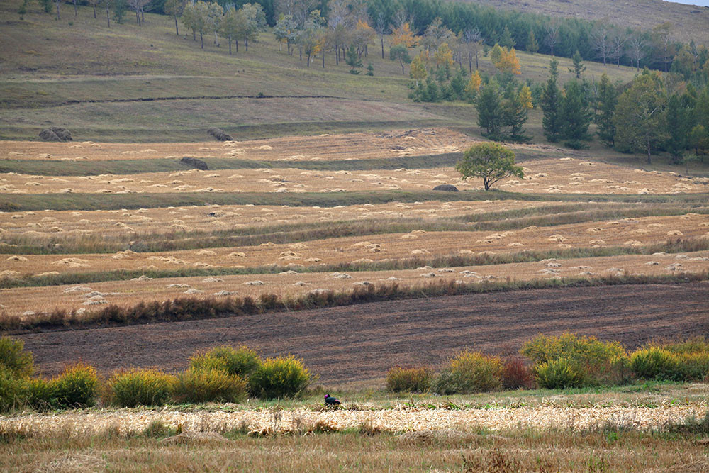坝上一年只种一季庄稼,现在正是秋收的档口,山坡上,割倒的庄稼整齐的码放在地里,站在路边的高岗上,拍摄下这一幅幅秋收的美景。