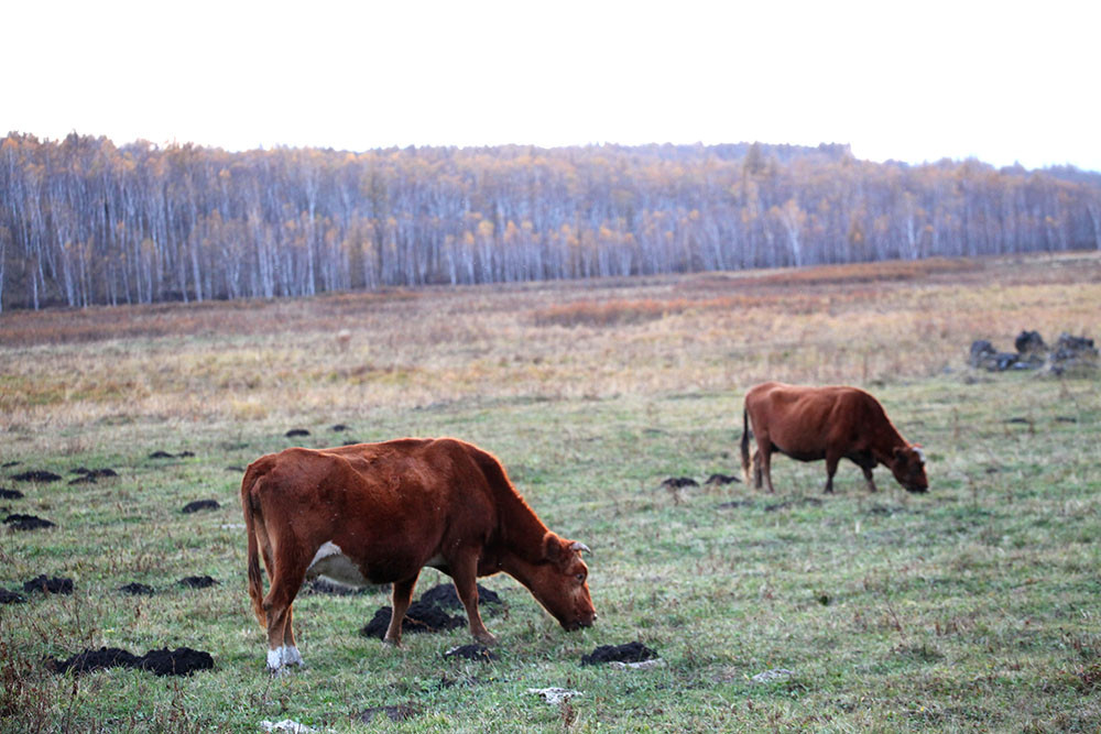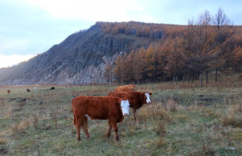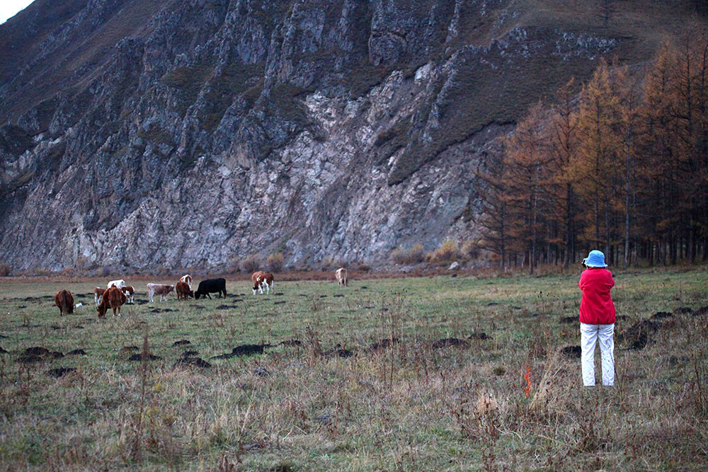 回到停车场,大家意犹未尽,开车直奔乌苏浪子湖。太阳已经落山,湖畔一片灰暗,转身回到不冻河畔,草地上的牛群成了大家晚霞中的主角。