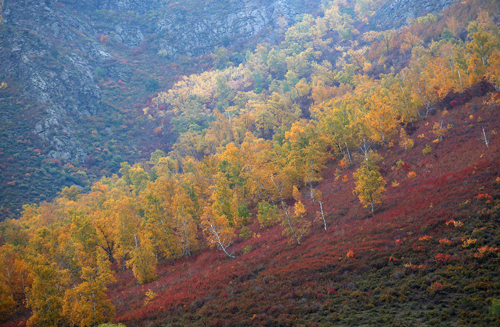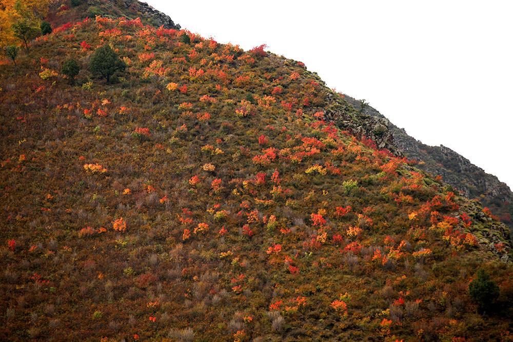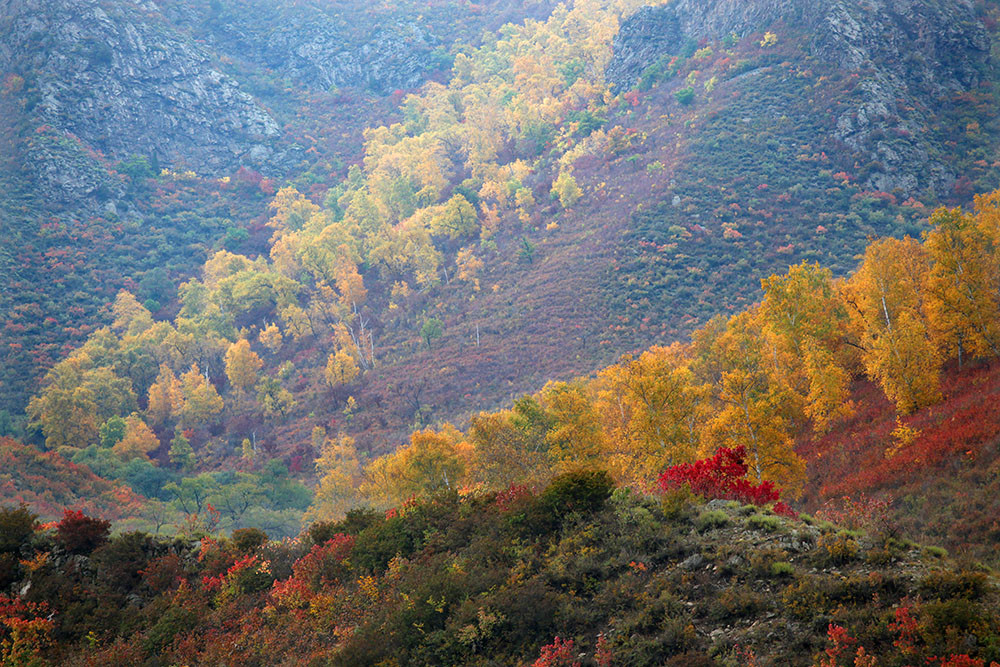 汽车在山沟里蜿蜒前行,前排及两边的摄友们目不转睛的瞧着窗外,突然,有人大声地喊停车,远处的山坳里,成片的彩林异常醒目,走几步,把它们纳入镜头里。