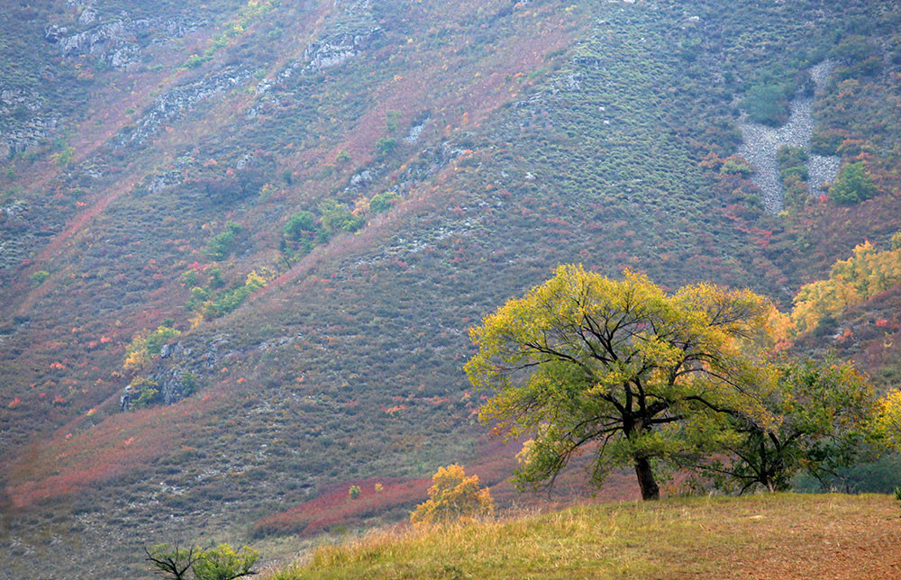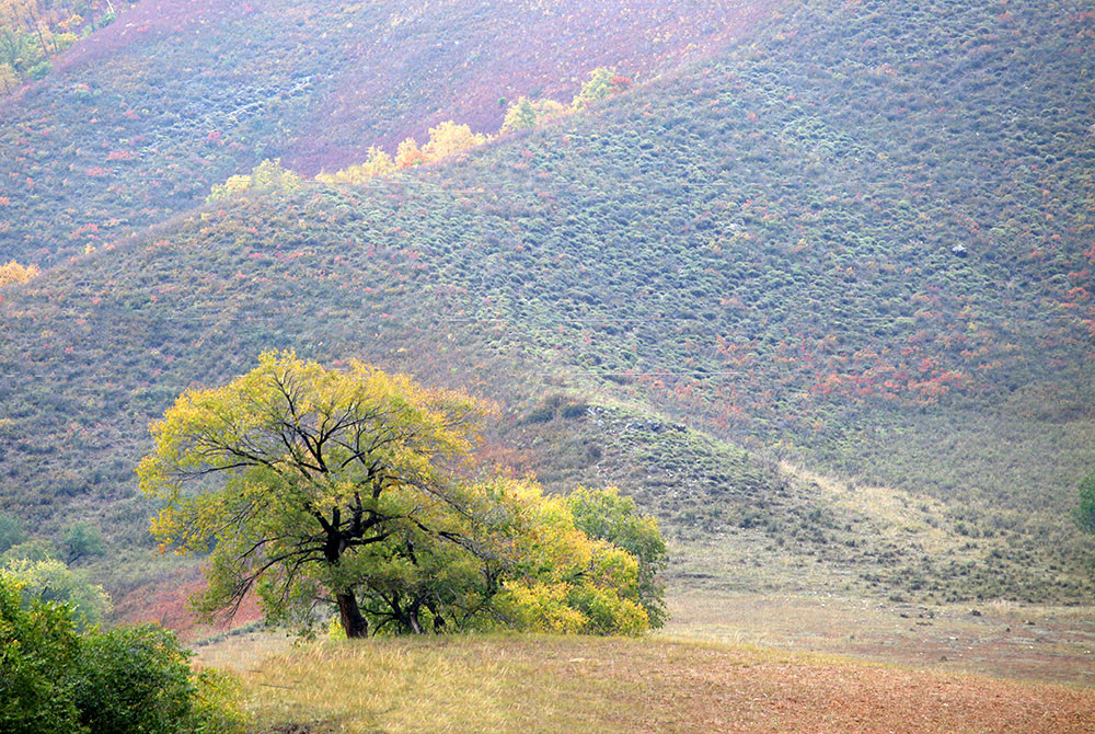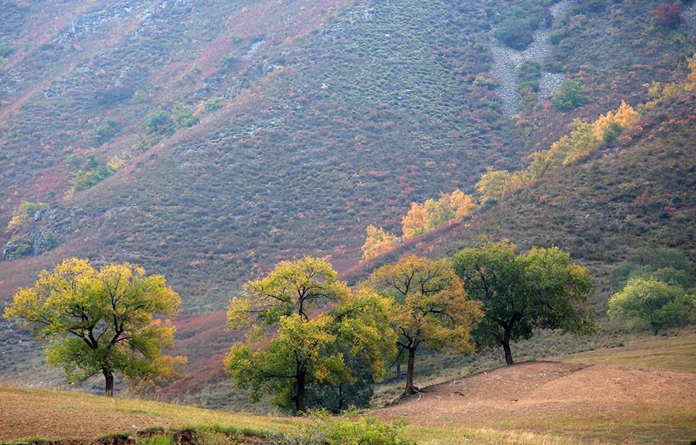 在一个山坳里,远处的几棵树吸引了我们,那树形、那光线、那色彩,拿起相机,用长焦拉过来。