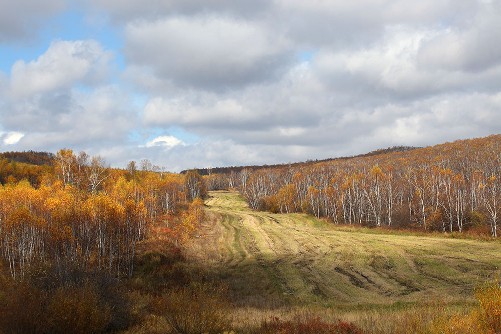 吃过午饭,天气逐渐晴了起来,蓝天白云给大地洒下斑斑驳驳的影子,汽车在路旁停下来,对过的白桦林中有一大片收割过的草地,面对美景,大家奔走着拍摄起来。