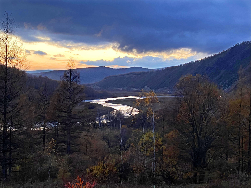 回程中,我们在半山腰伫立,夕阳下,不冻河闪闪发光。