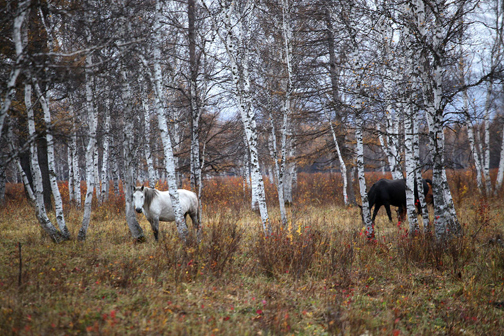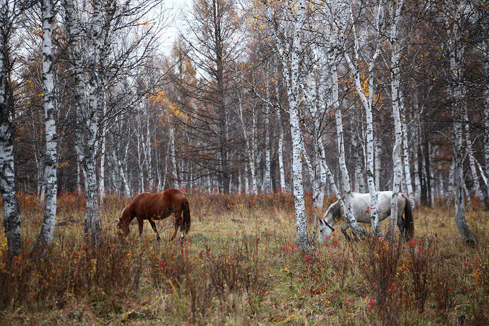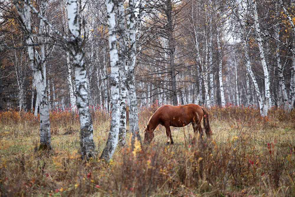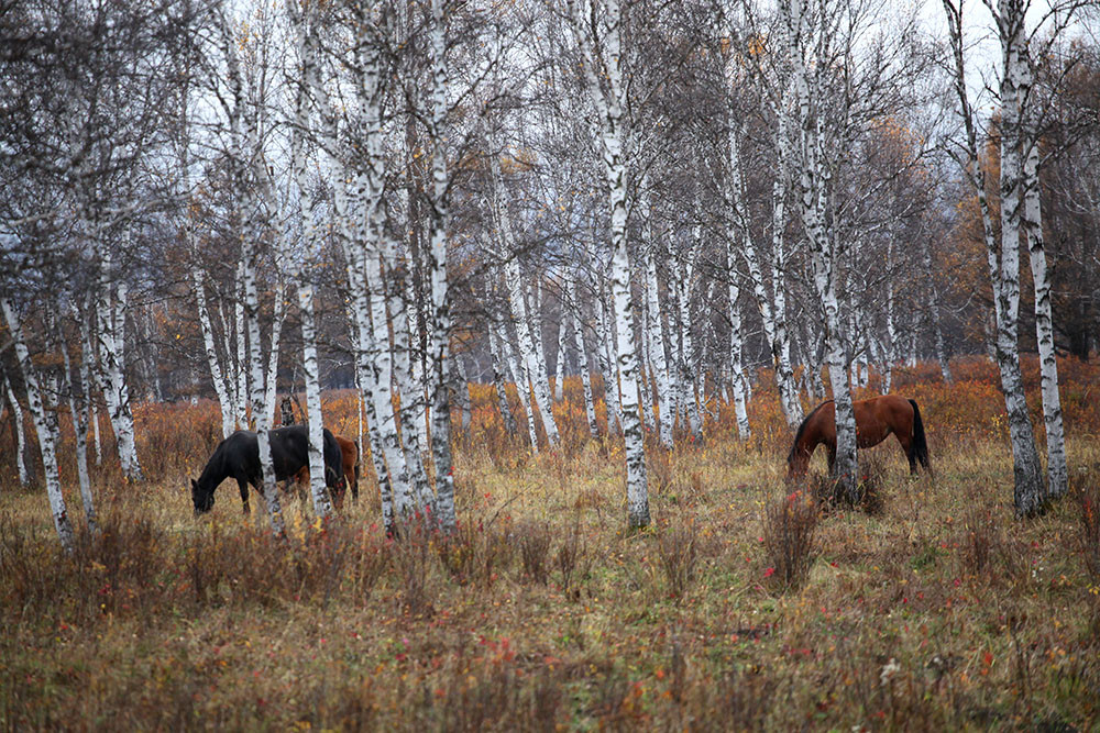 路过一片白桦林,马儿在林间草地上悠闲的吃草,悄悄走过去,来一组白桦林间的牧马图。