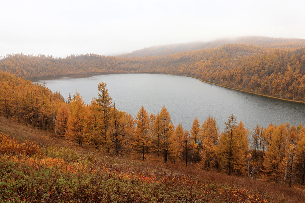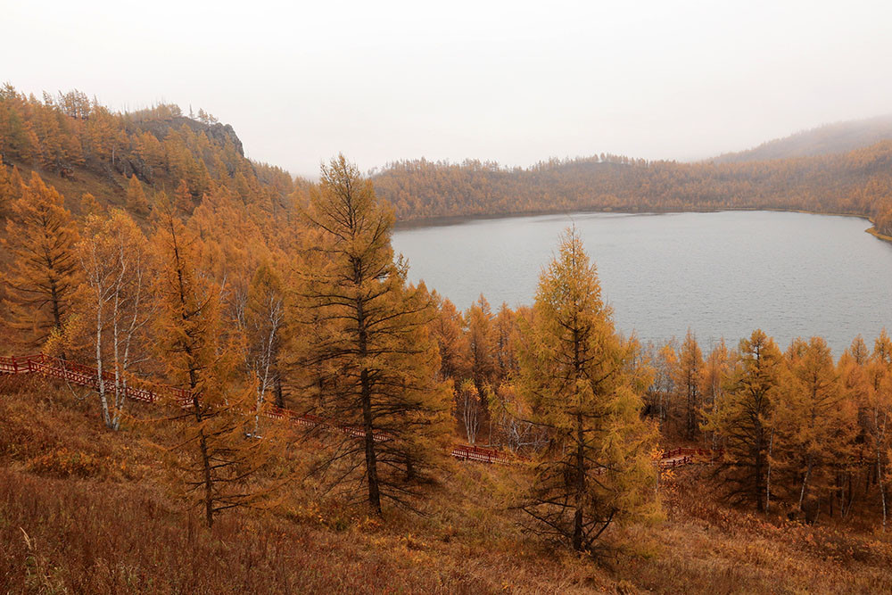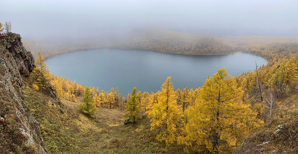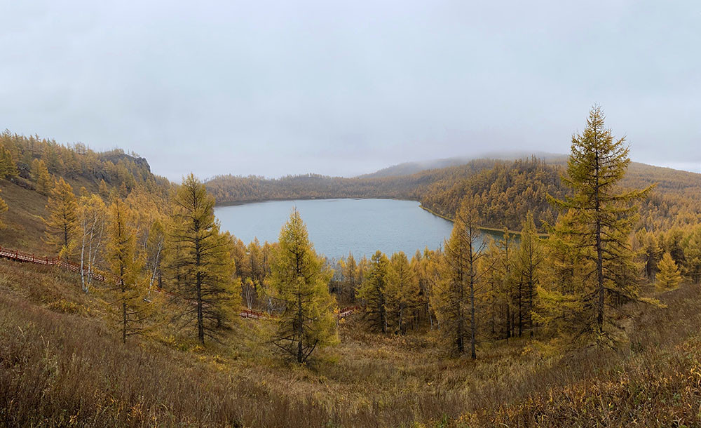 山上的观景台是拍摄驼峰岭天池的好地方,用全景模式横扫过去,活像一只鞋的底子,对岸薄雾弥漫,一片白茫茫的。