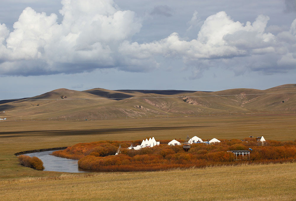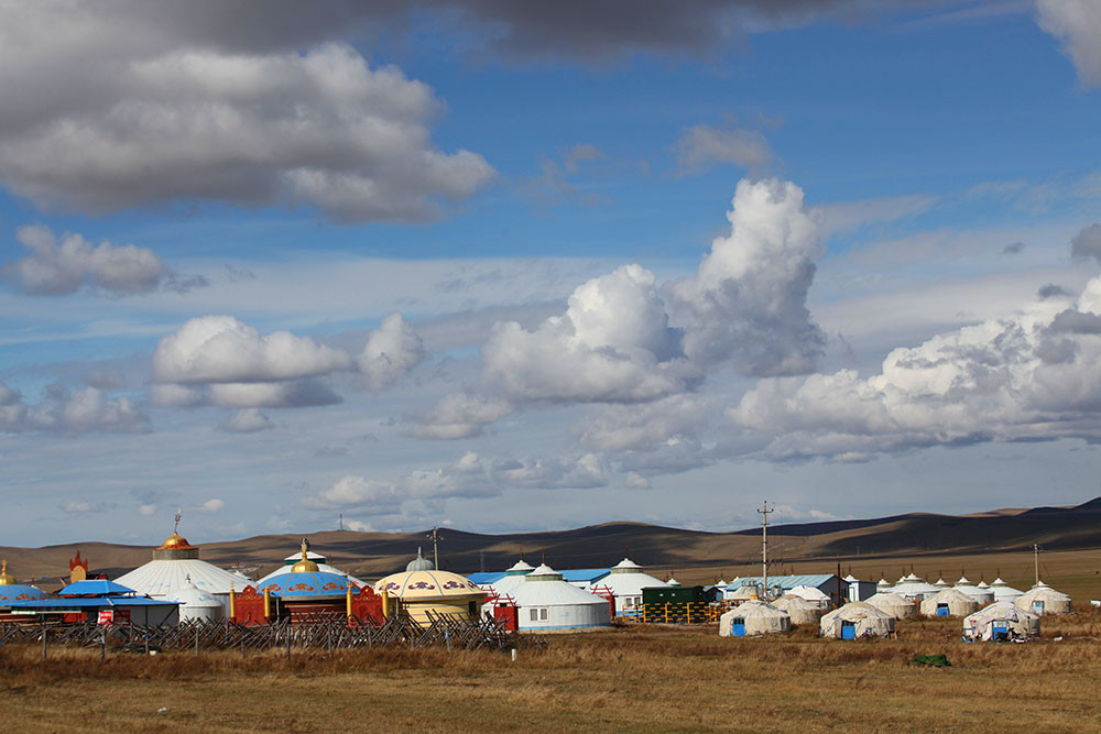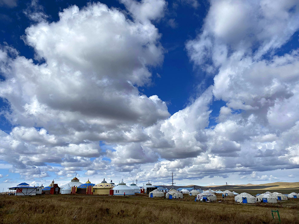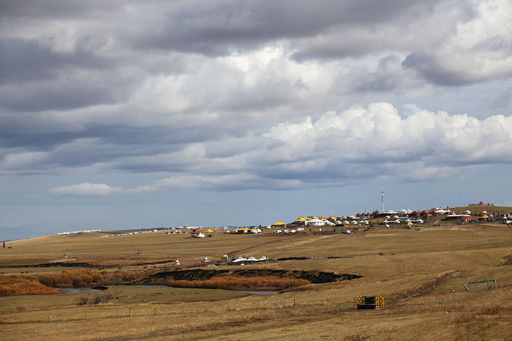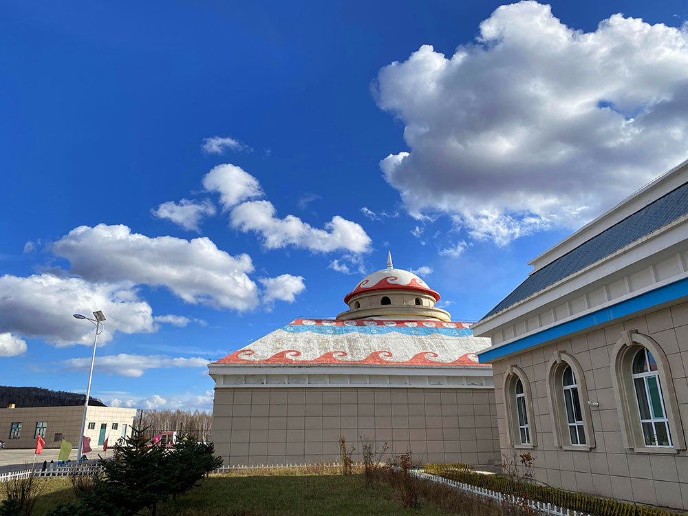 总觉着上高速赶路有点无聊,于是建议去金帐汗看看,那里是呼伦贝尔草原著名的景点,蓝天白云下,金帐汗的建筑在阳光下闪闪发光。