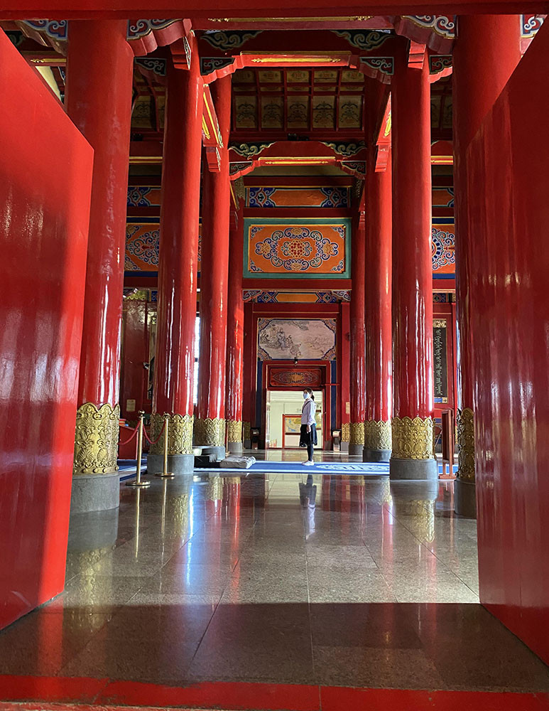 正殿当中有16根粗大的红漆明柱,四周绘有反映成吉思汗业绩的图案,中央为2.8米高的成吉思汗铜像。