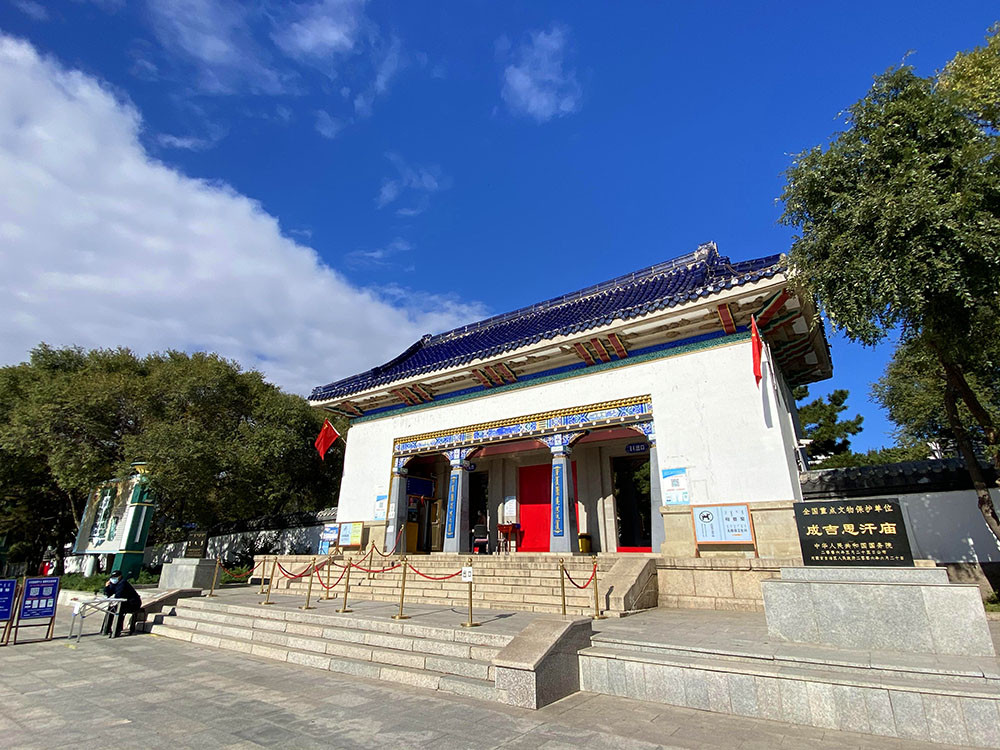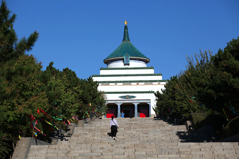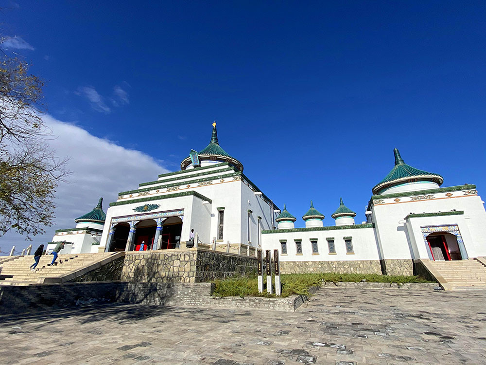 成吉思汗庙坐落在乌兰浩特市的罕山之巅, 1940年5月5日动工修建,1944年10月10日竣工。用长焦拉过来,这座蓝色圆顶的建筑非常肃穆庄严。