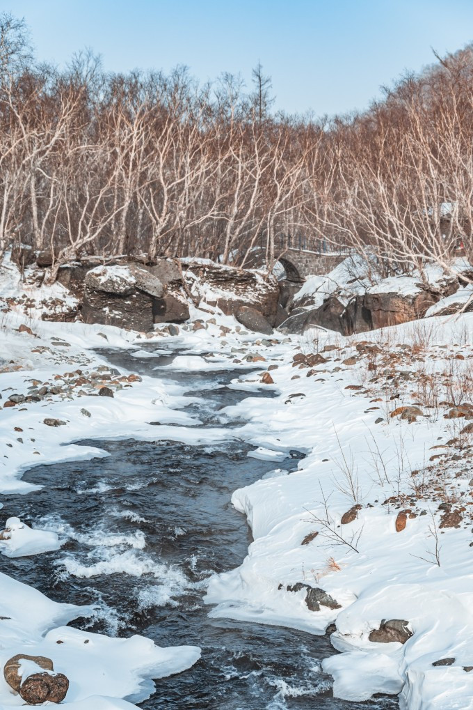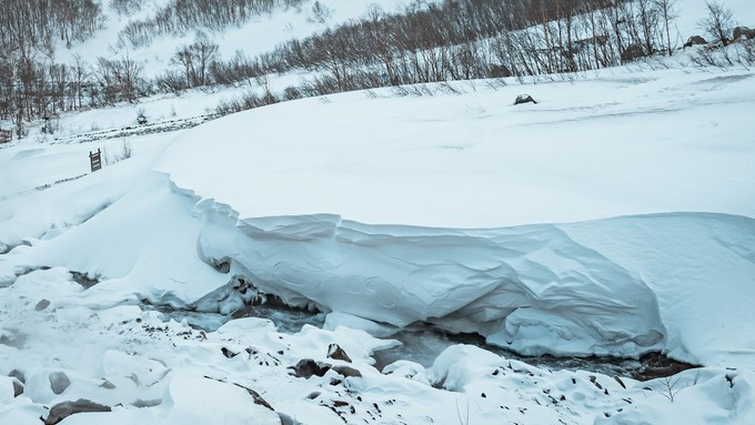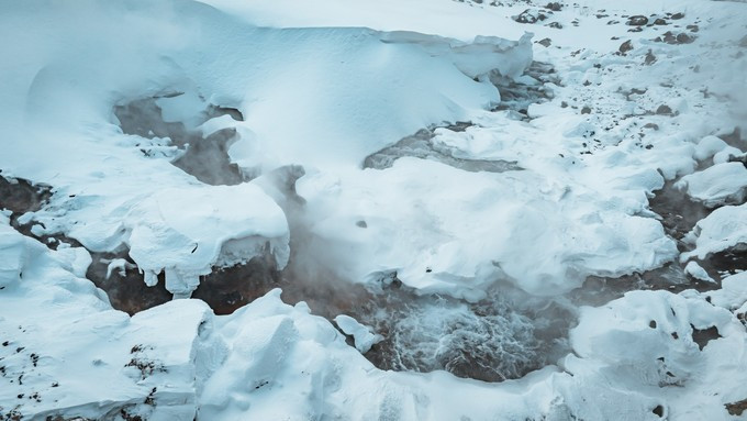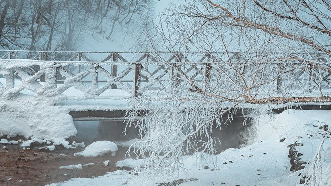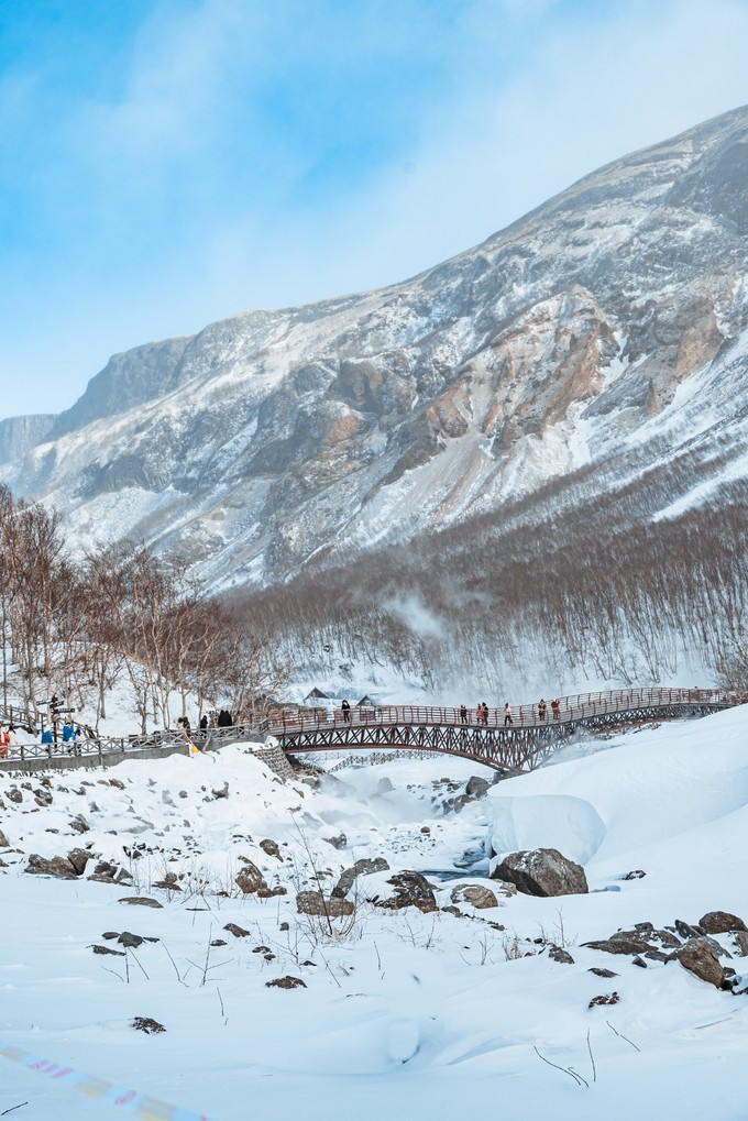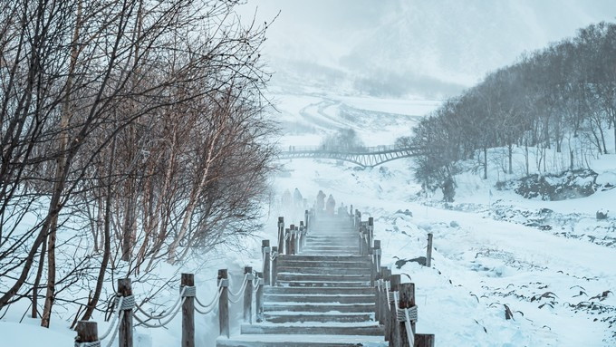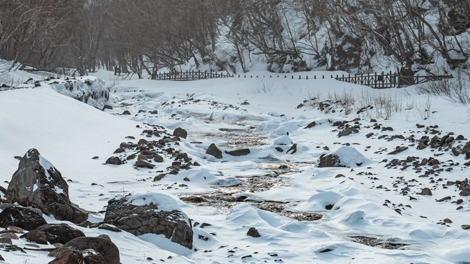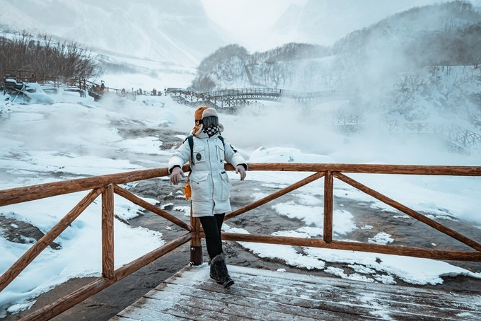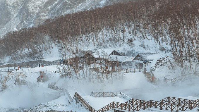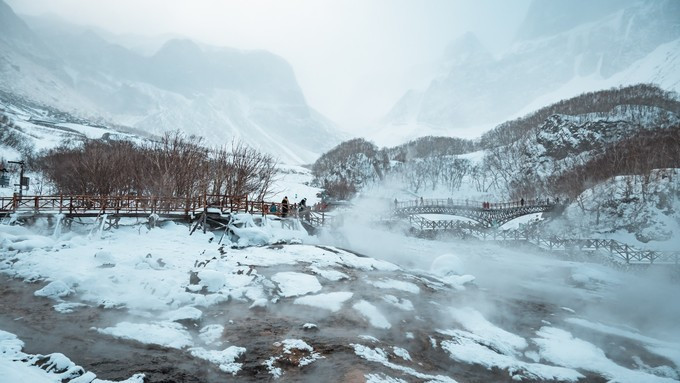 温热的山泉在雪中流淌,烟雾缥缈,似人间仙境般