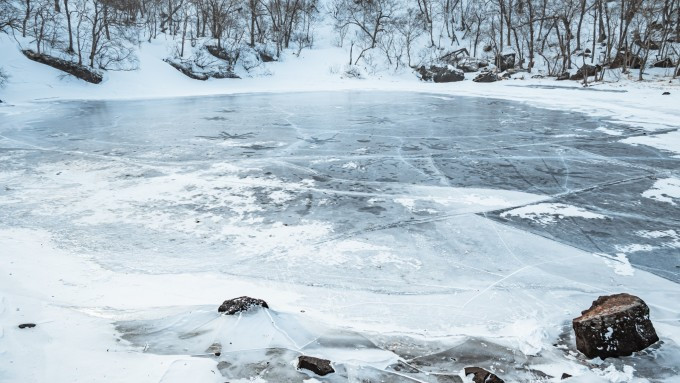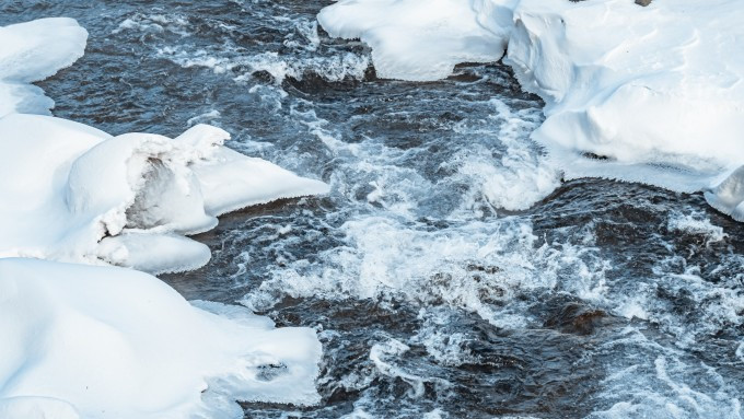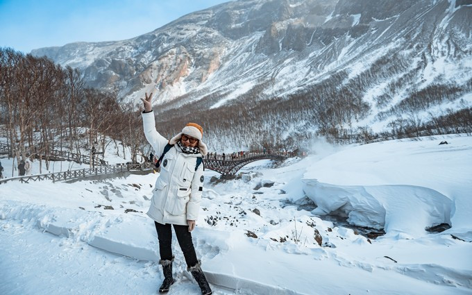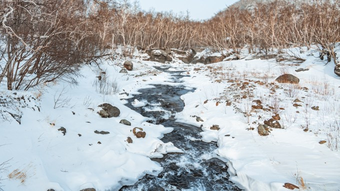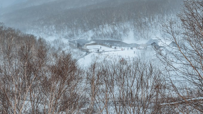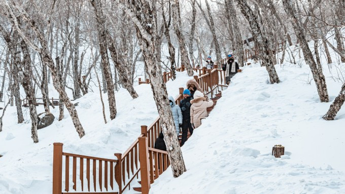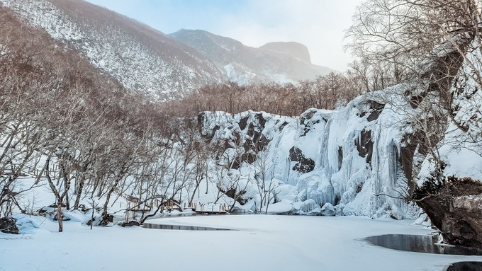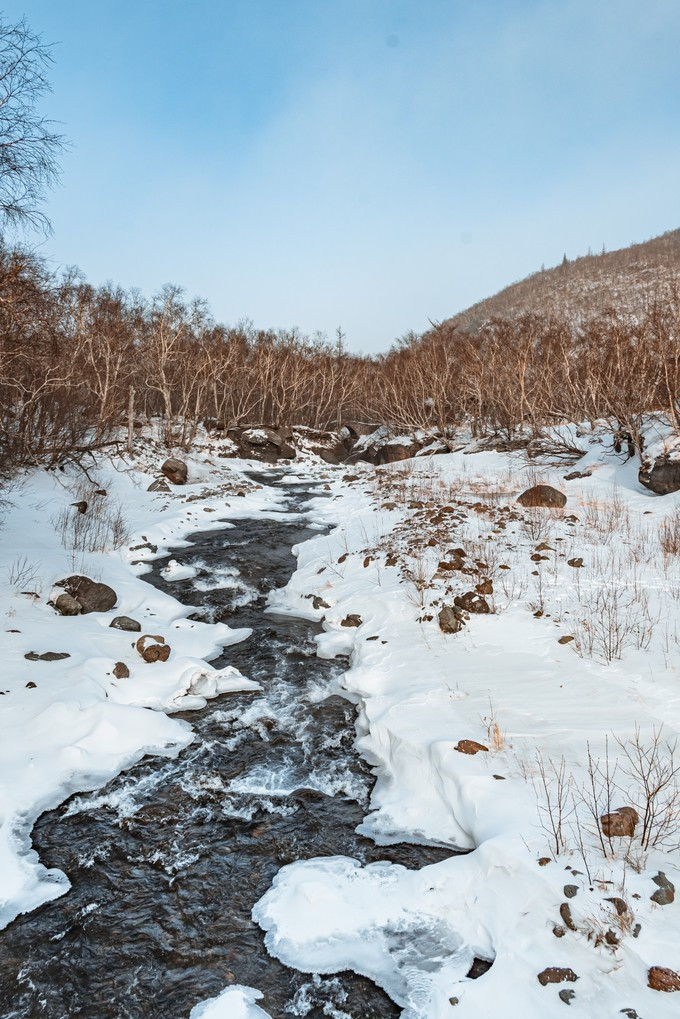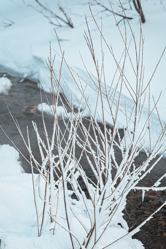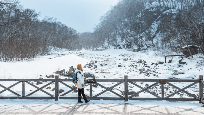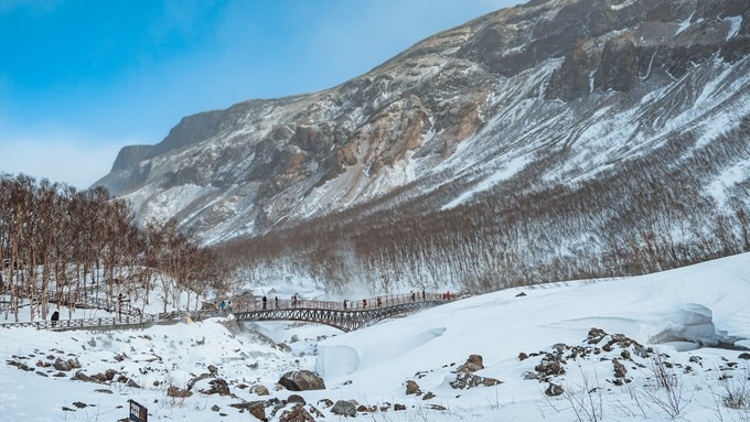 温热的山泉在雪中流淌,烟雾缥缈,似人间仙境般