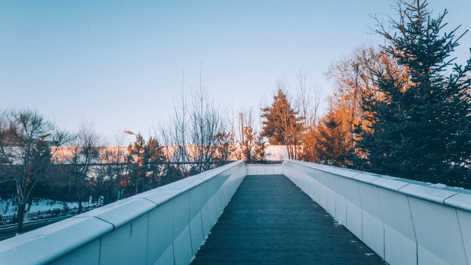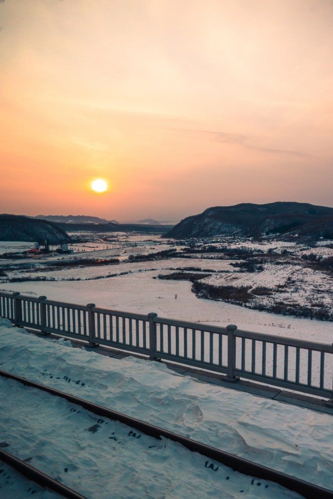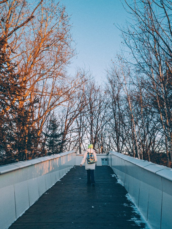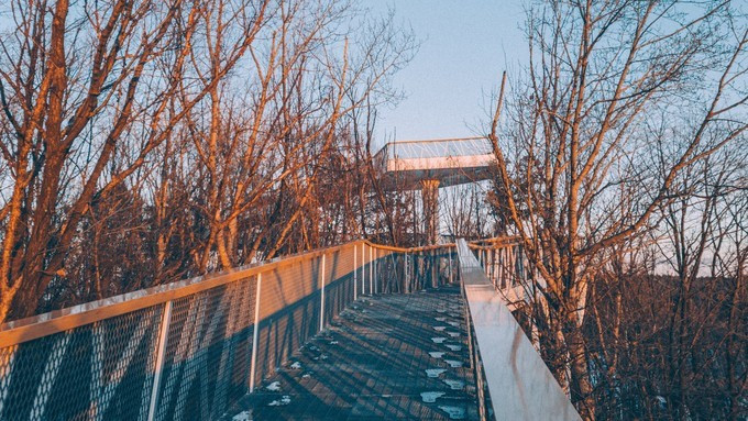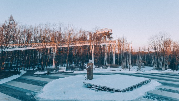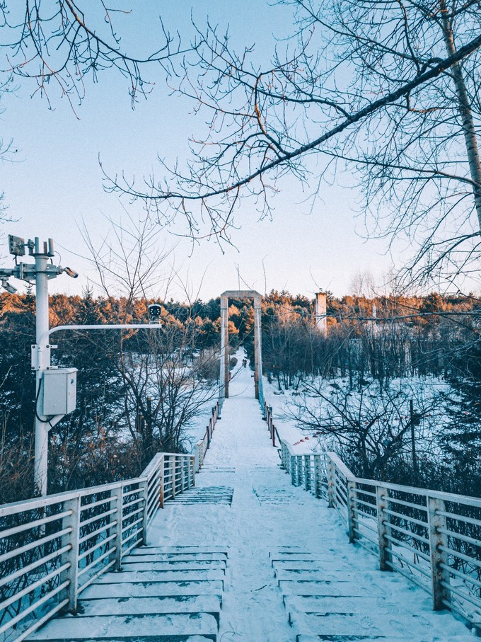 结束滑雪后,司机接上我们回程,看时间3点多,直接送到小镇的美人松空中廊桥公园看日落。