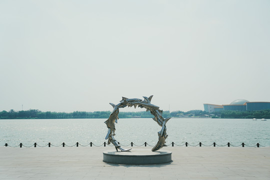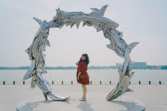 站在六条鱼组成的圆形拱门雕塑中间,背景是一望无际的湖面,标准游客照打卡!哈哈哈~拍照还可以躲在大树背后,坐在草地上,自然又俏皮~