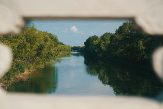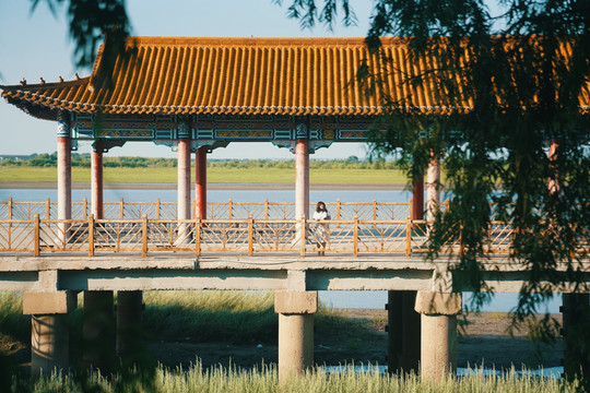 亭台楼阁,碧水环绕,有几分江南风光。沿岸边古道前行,一眼望见铁索桥、钟鼓楼,又是一种北方的豪迈之情。嫩江湾就是这么一个刚柔并济、南北融合的奇妙之地。