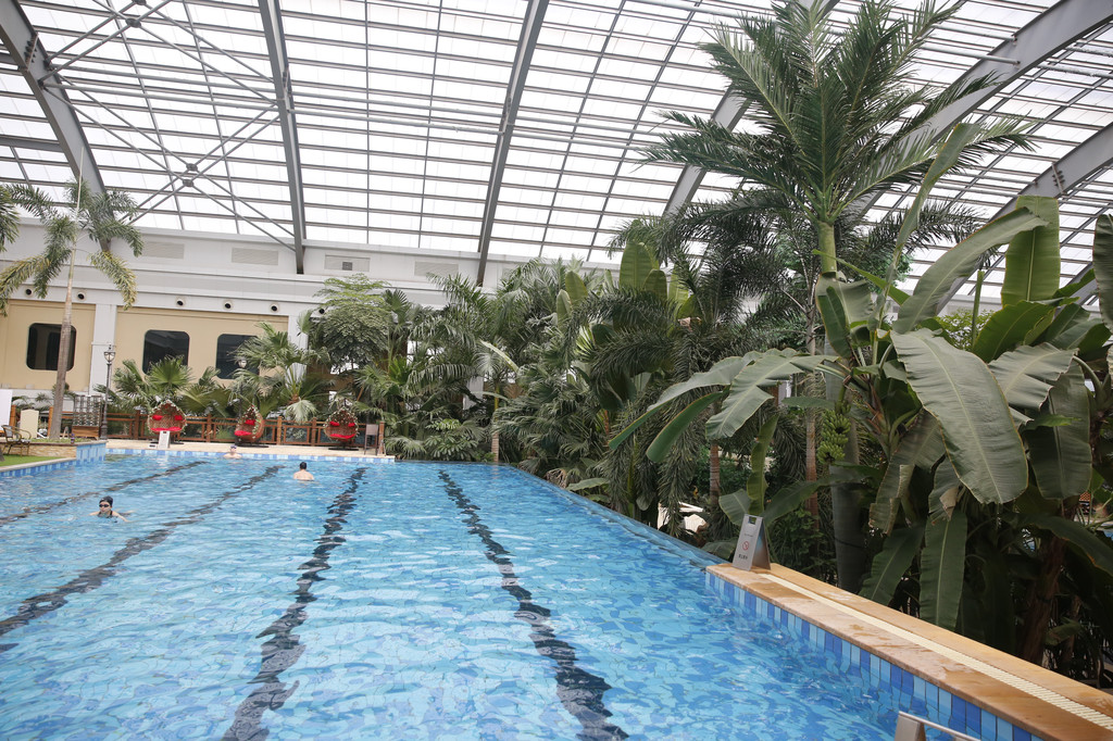 到室内恒温无边泳池游泳,累了就上岸在竹椅上躺下,玩玩手机或闭目养养神。儿童馆还有室内冲浪和空中漂流,这两个都是固定时间免费开放的,中医馆的五行池特别适合中老年人泡汤疗养。